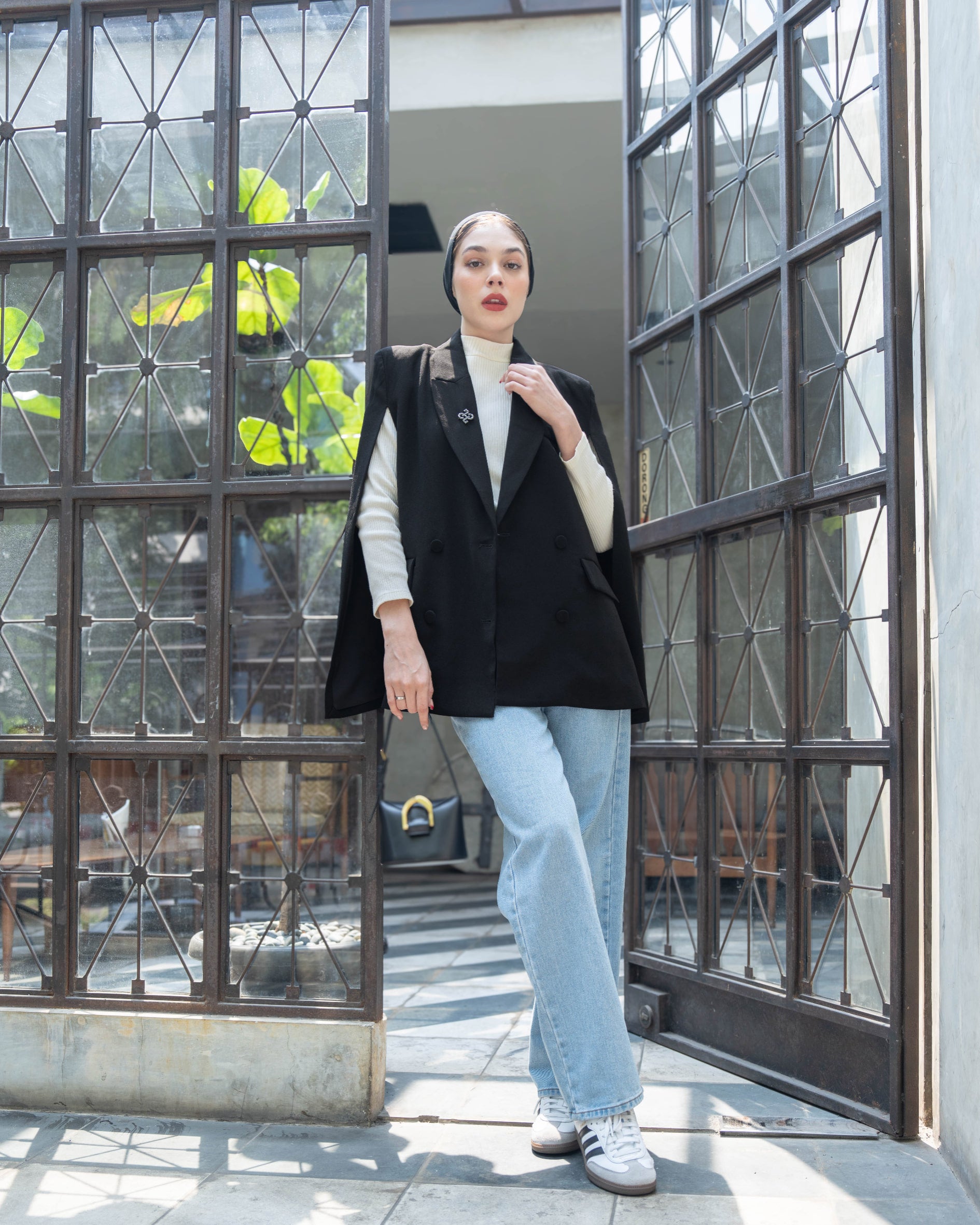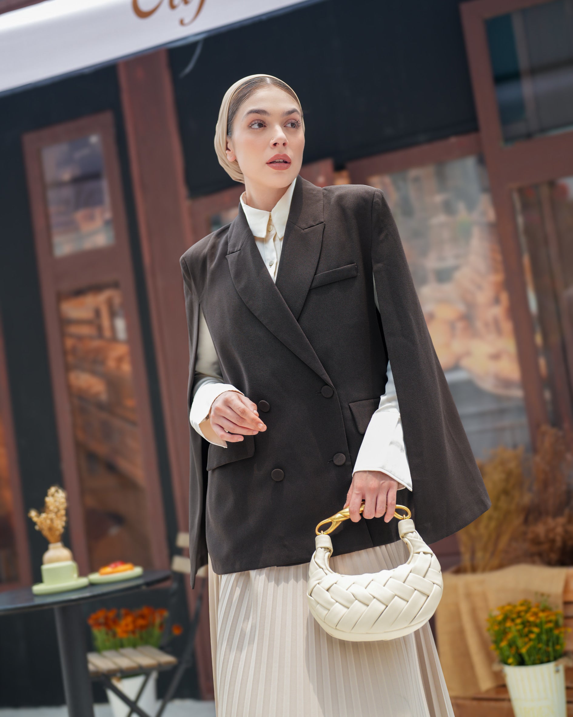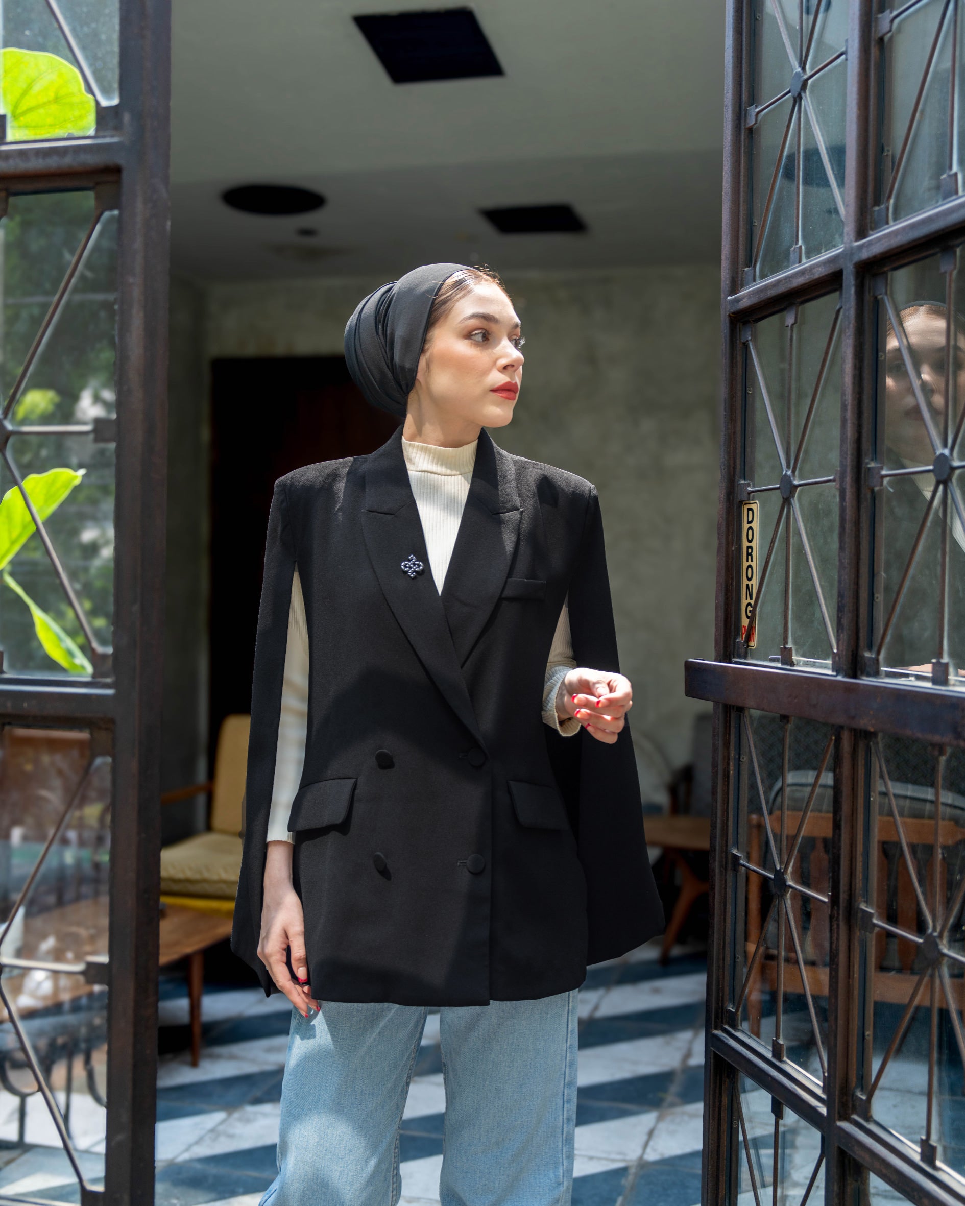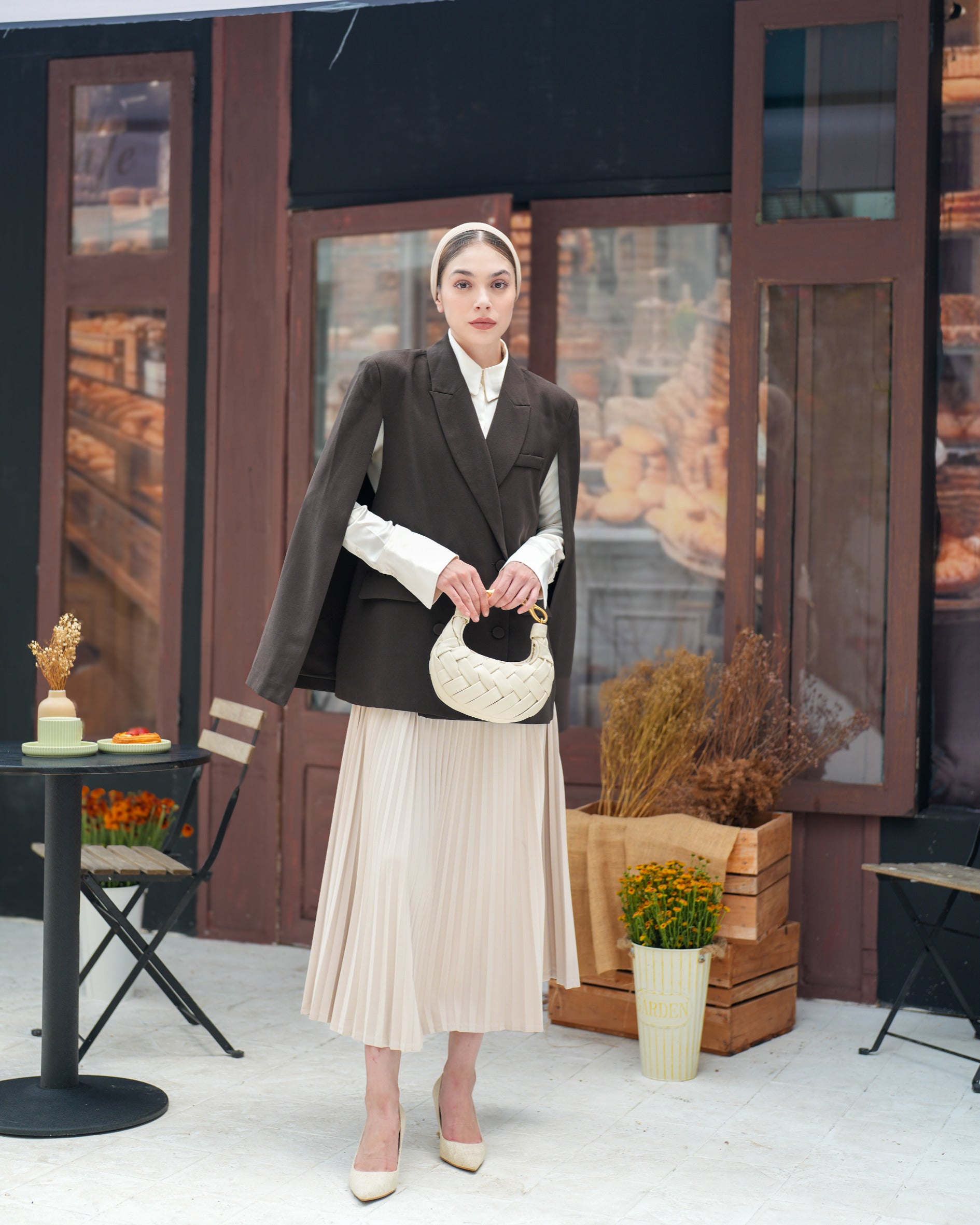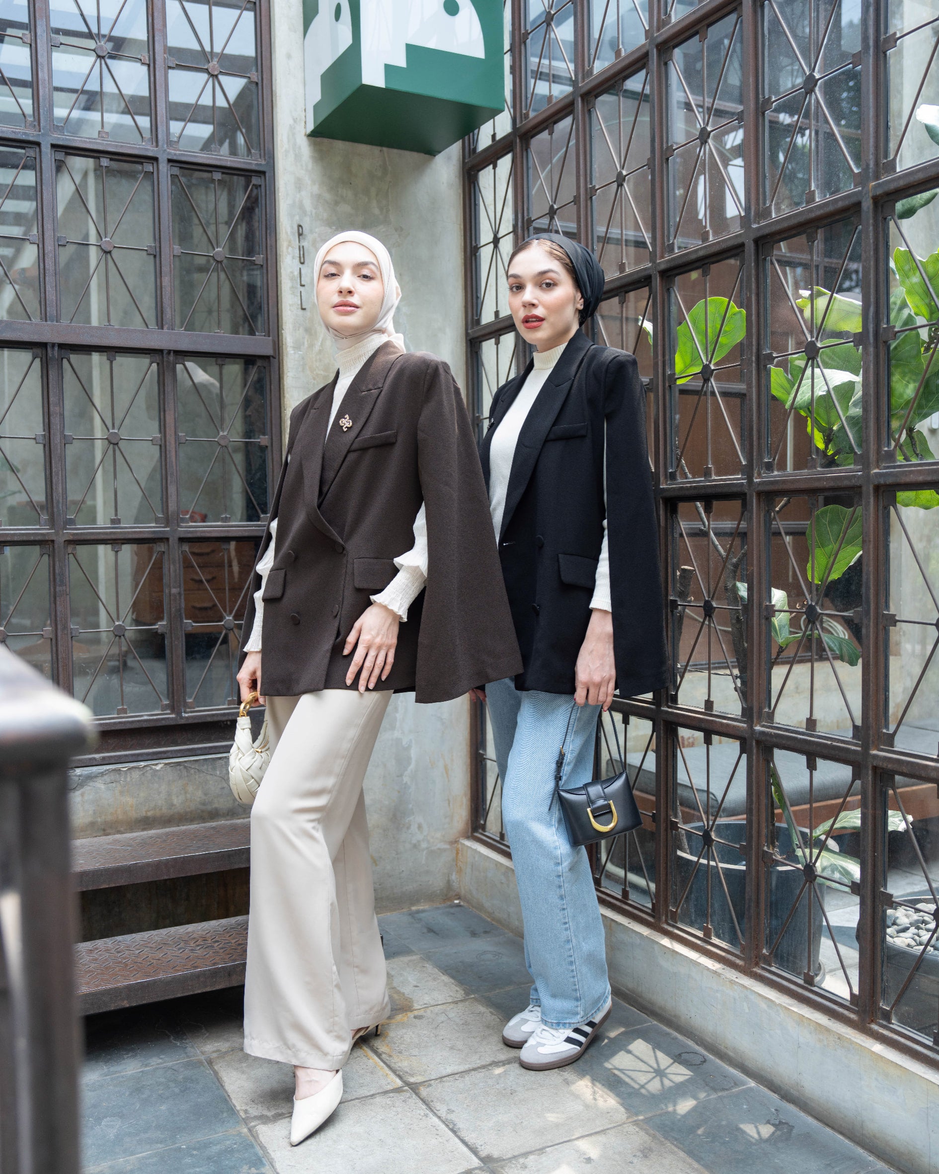 Tampil sophisticated dengan Alexa Cape, cape yang terlihat classy dengan detail slit, shirt collar, matching button, serta kantong depan. Materialnya sangat ringan, ketebalan bahannya juga pas, flowy dan tidak kaku, sangat nyaman untuk segala suasana, bisa untuk gaya smart casual atau formal.
