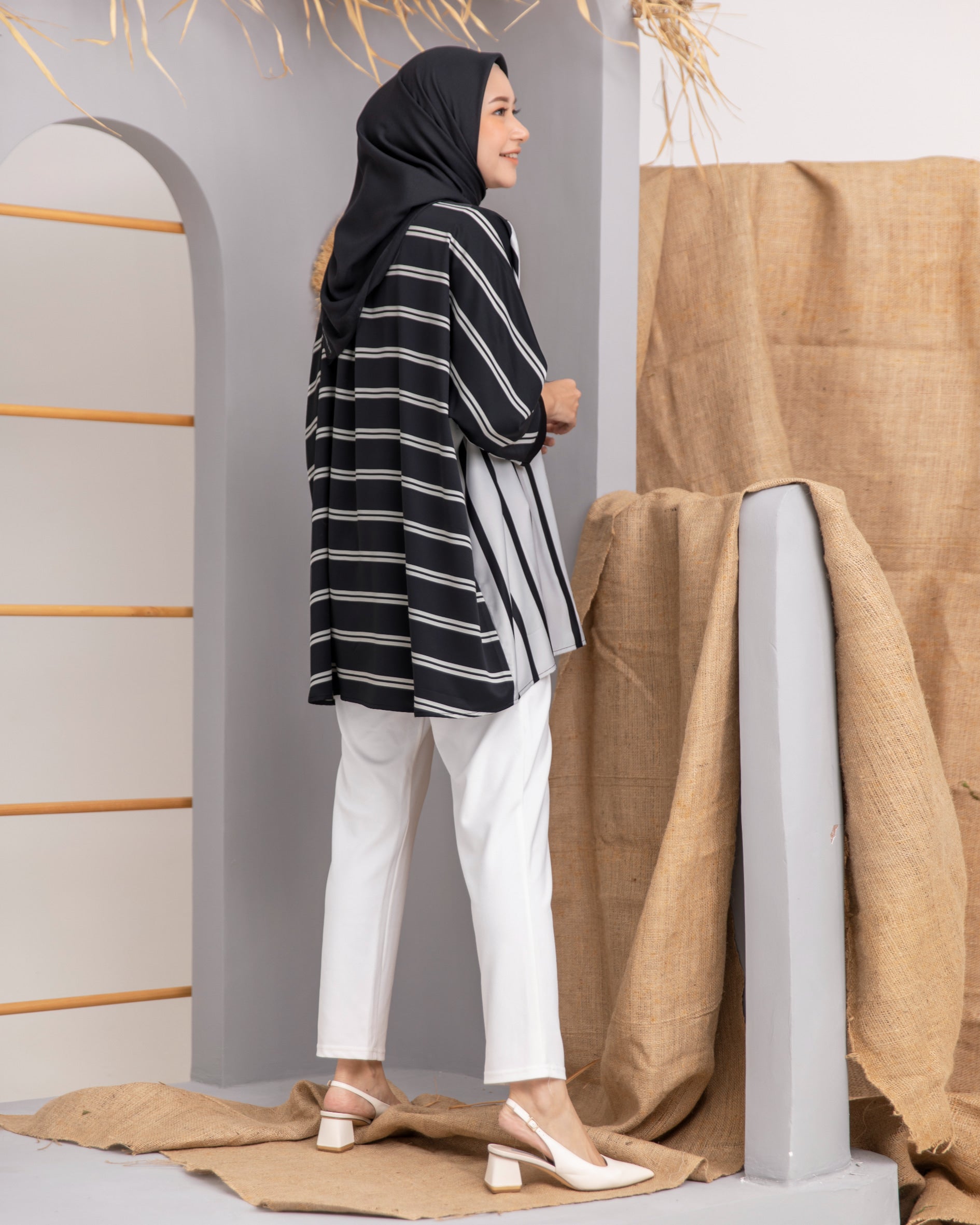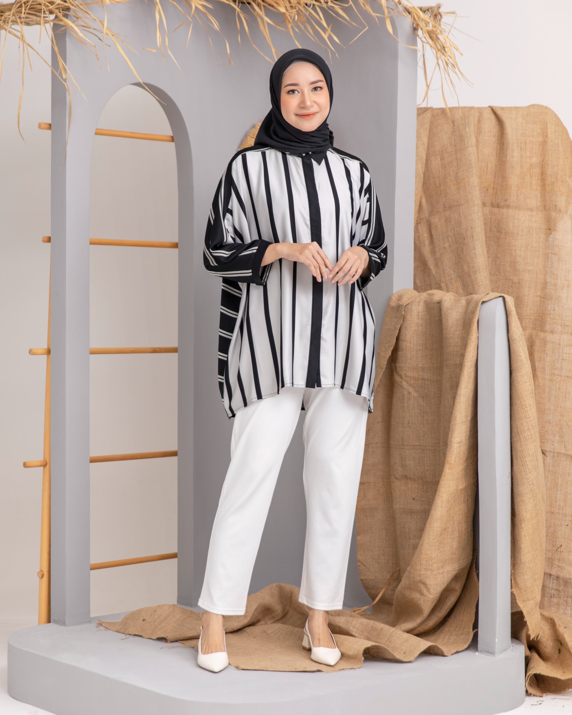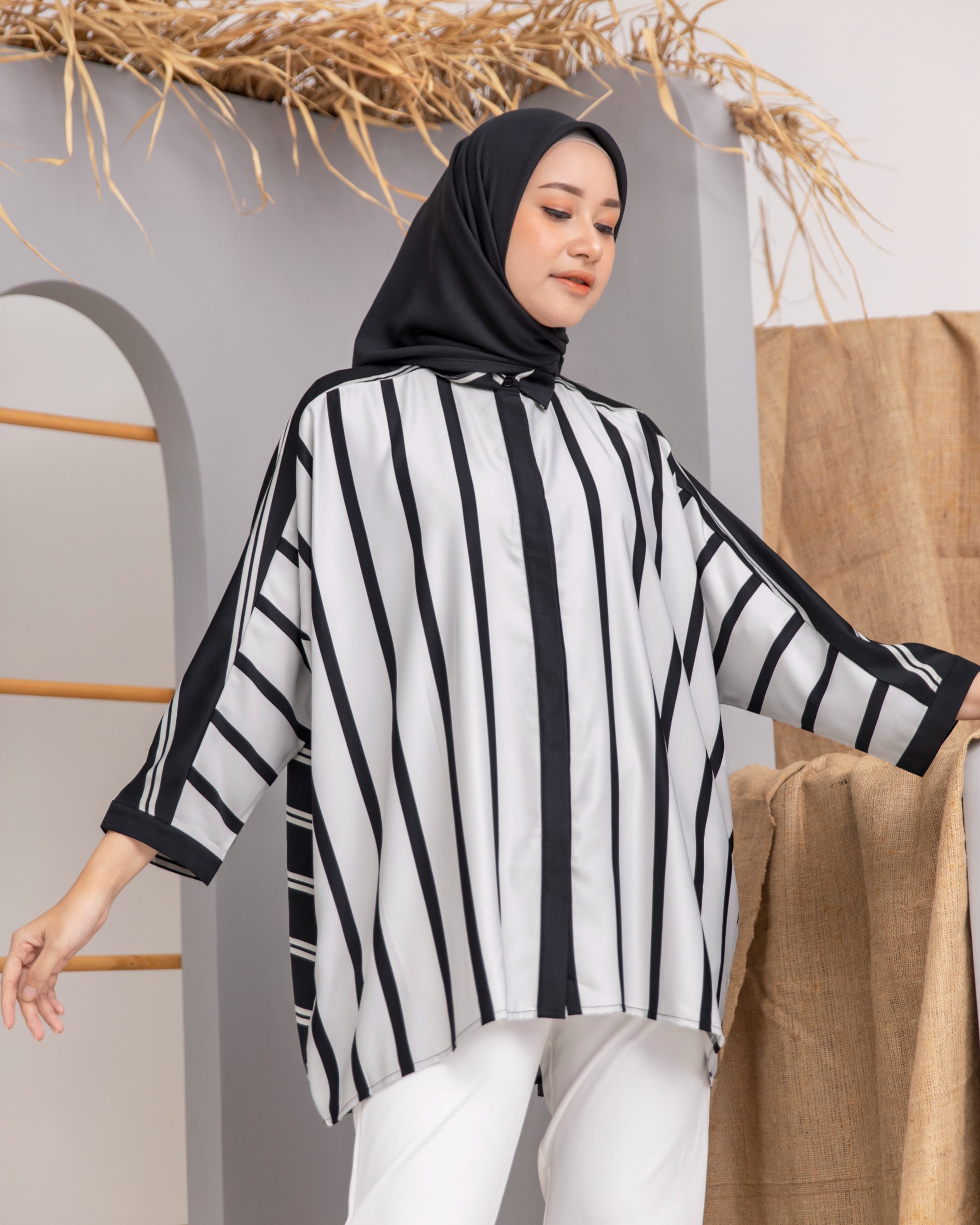Atasan stripe dengan pola batwing lebar dada menyambung ke tangan, sehingga ukuran dada akan lebih lebar dari biasanya. Untuk pola bahu tetap tetap seperti size normal, jadi pilih SIZE SEPERTI BIASA YA💕