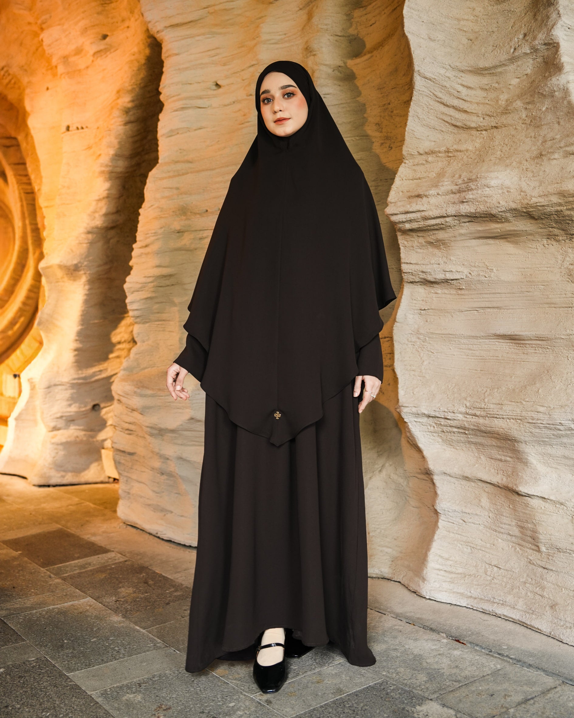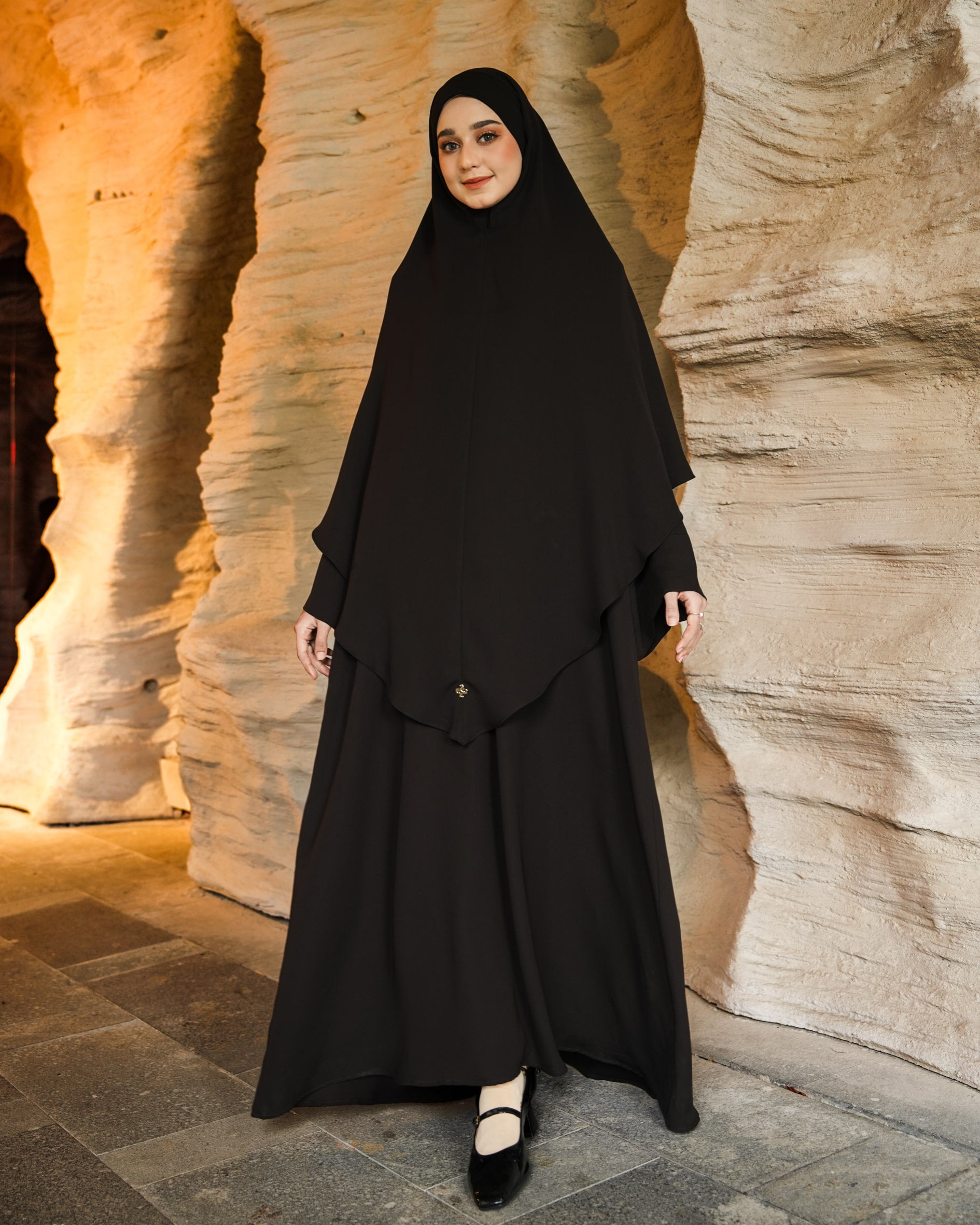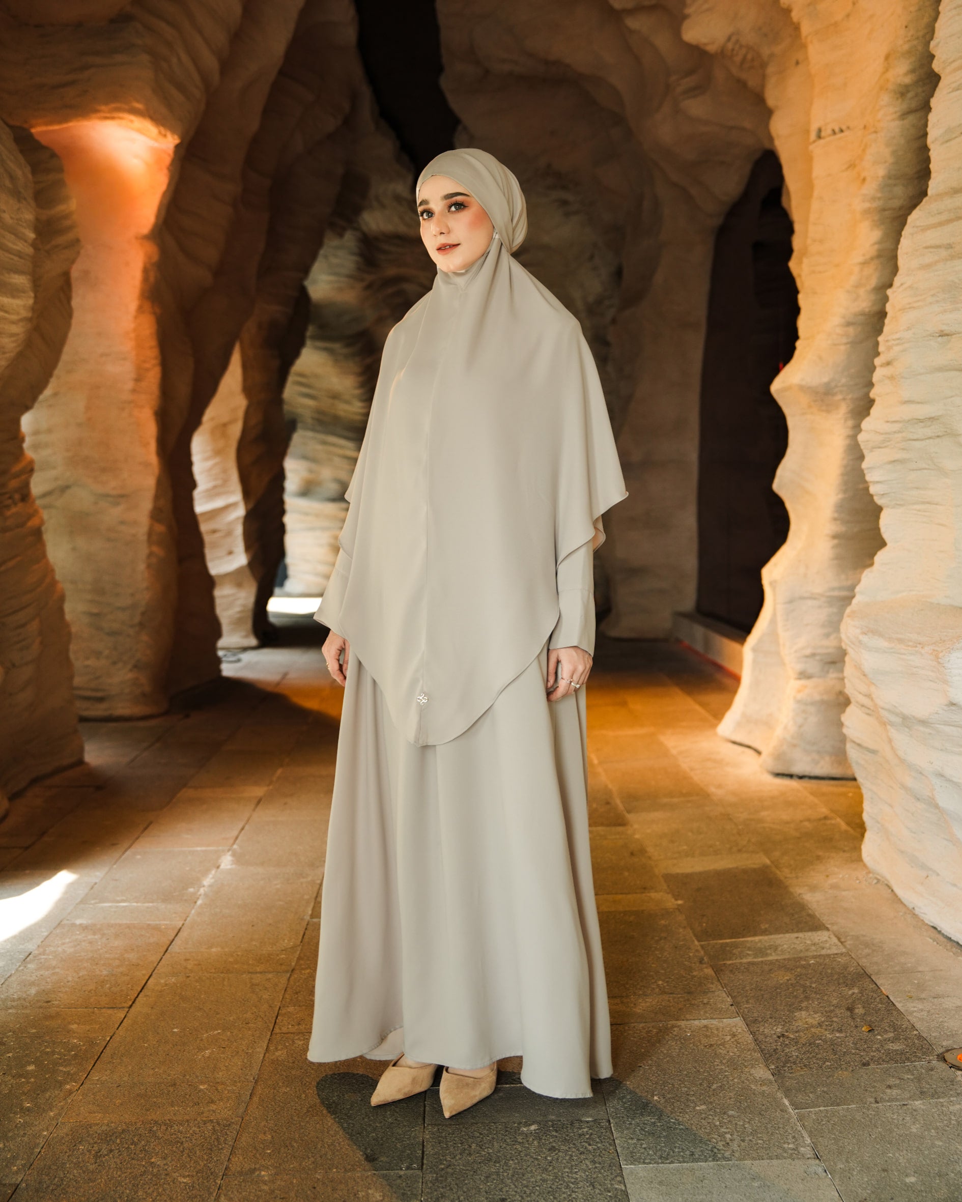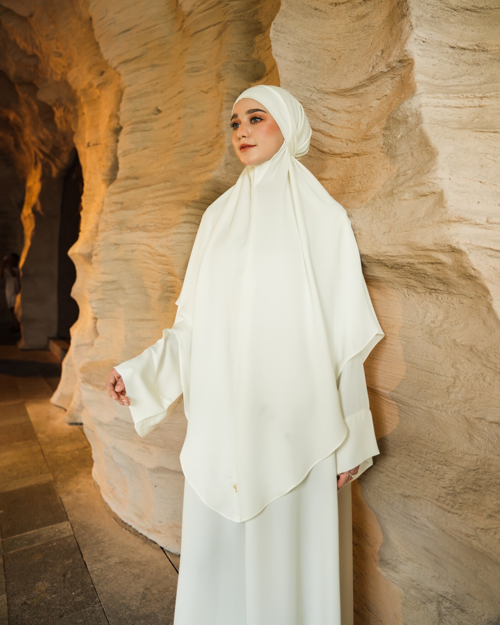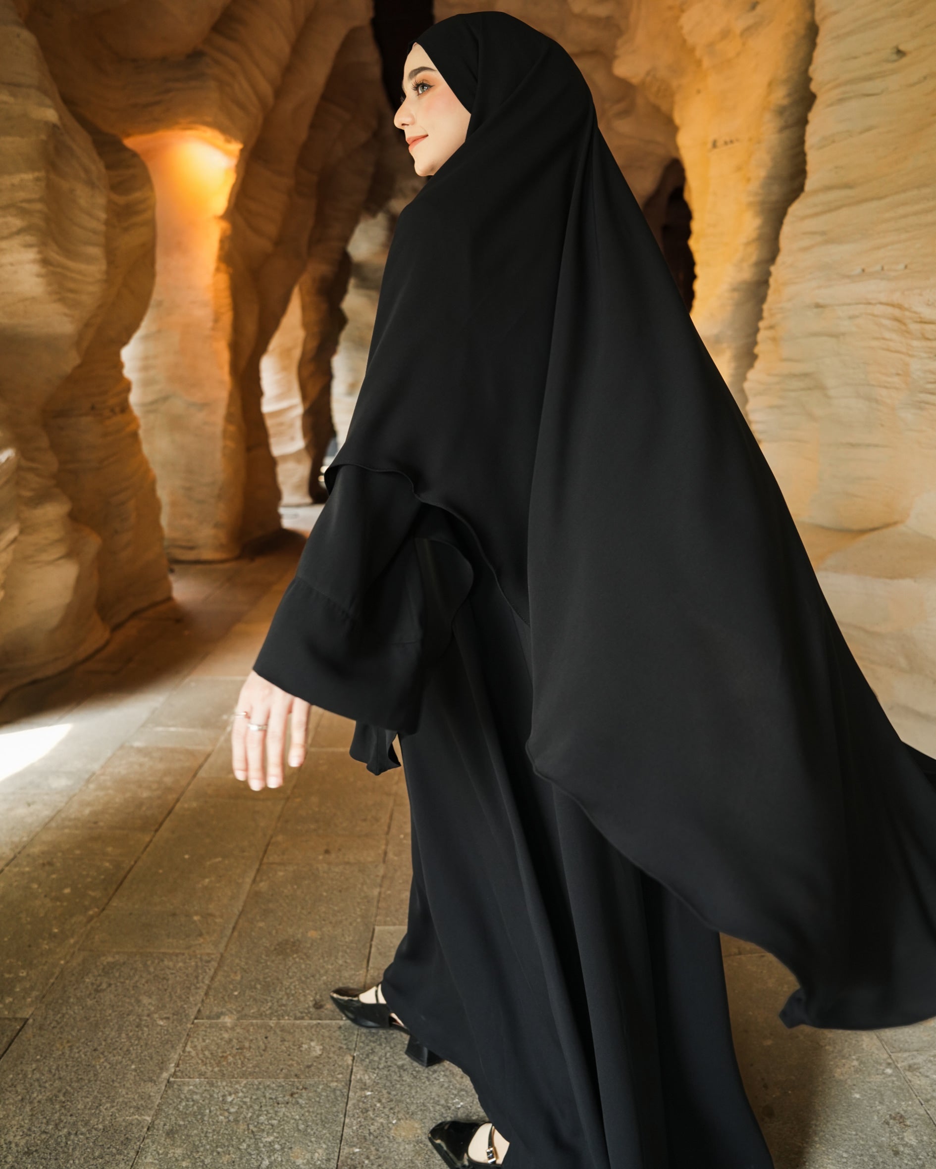 Sudah dilengkapi hijab syar’i senada model slip, ukuran hijab besar, dilengkapi detail tali yang bisa menyesuaikan dengan ukuran dan bentuk wajah, tali bisa di-styling ke belakang atau ke bagian dalam. Material super nyaman, ringan, dan flowy.
