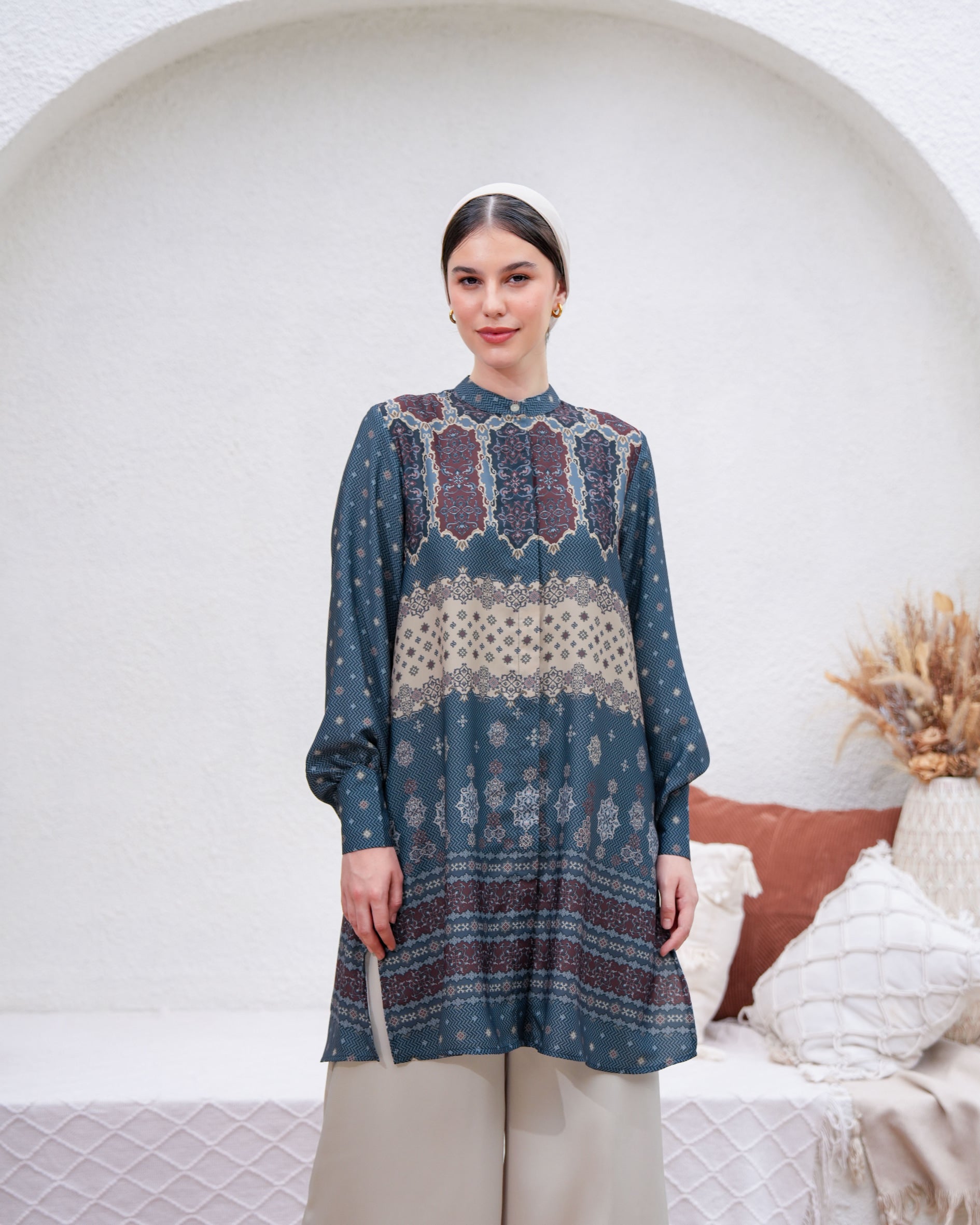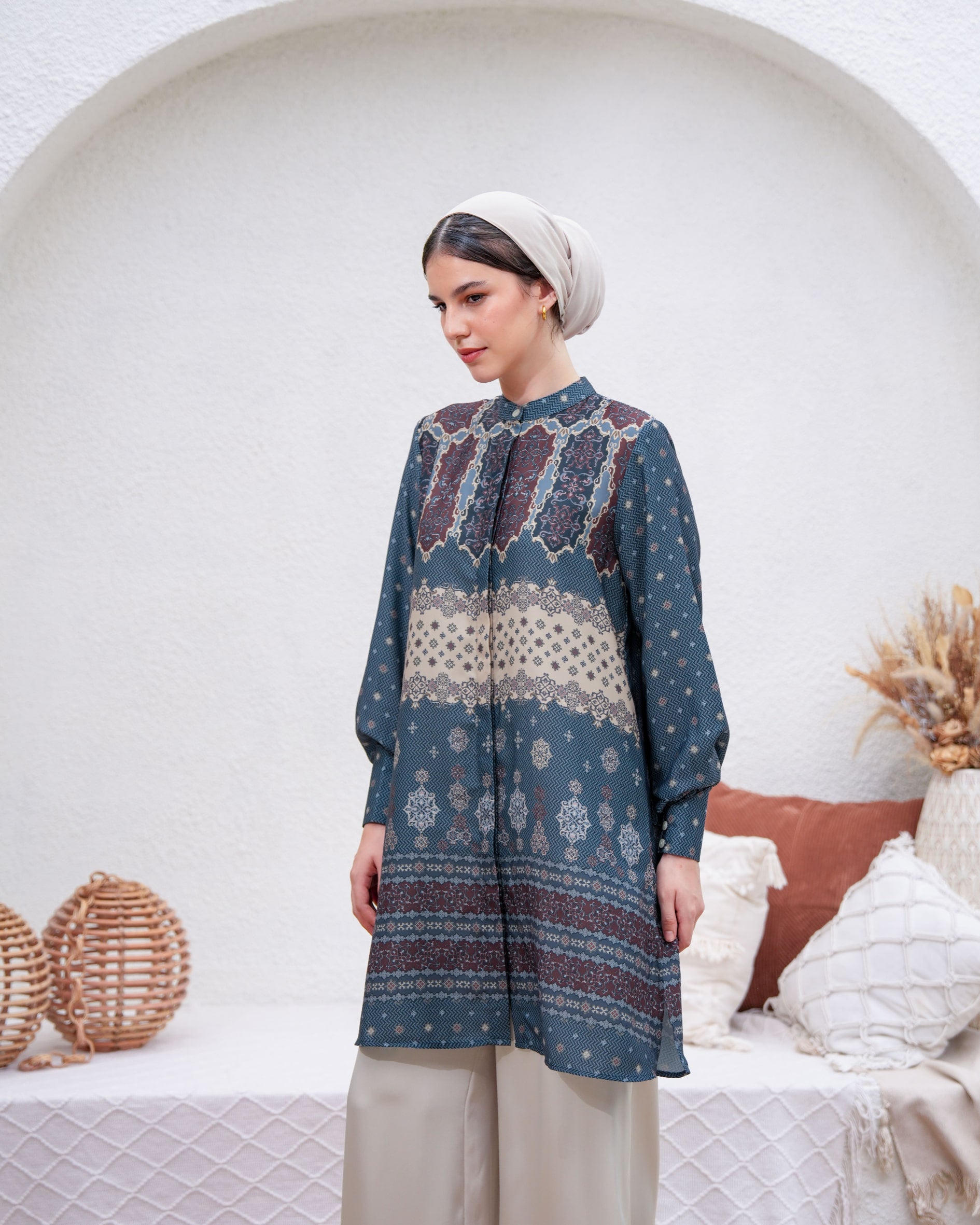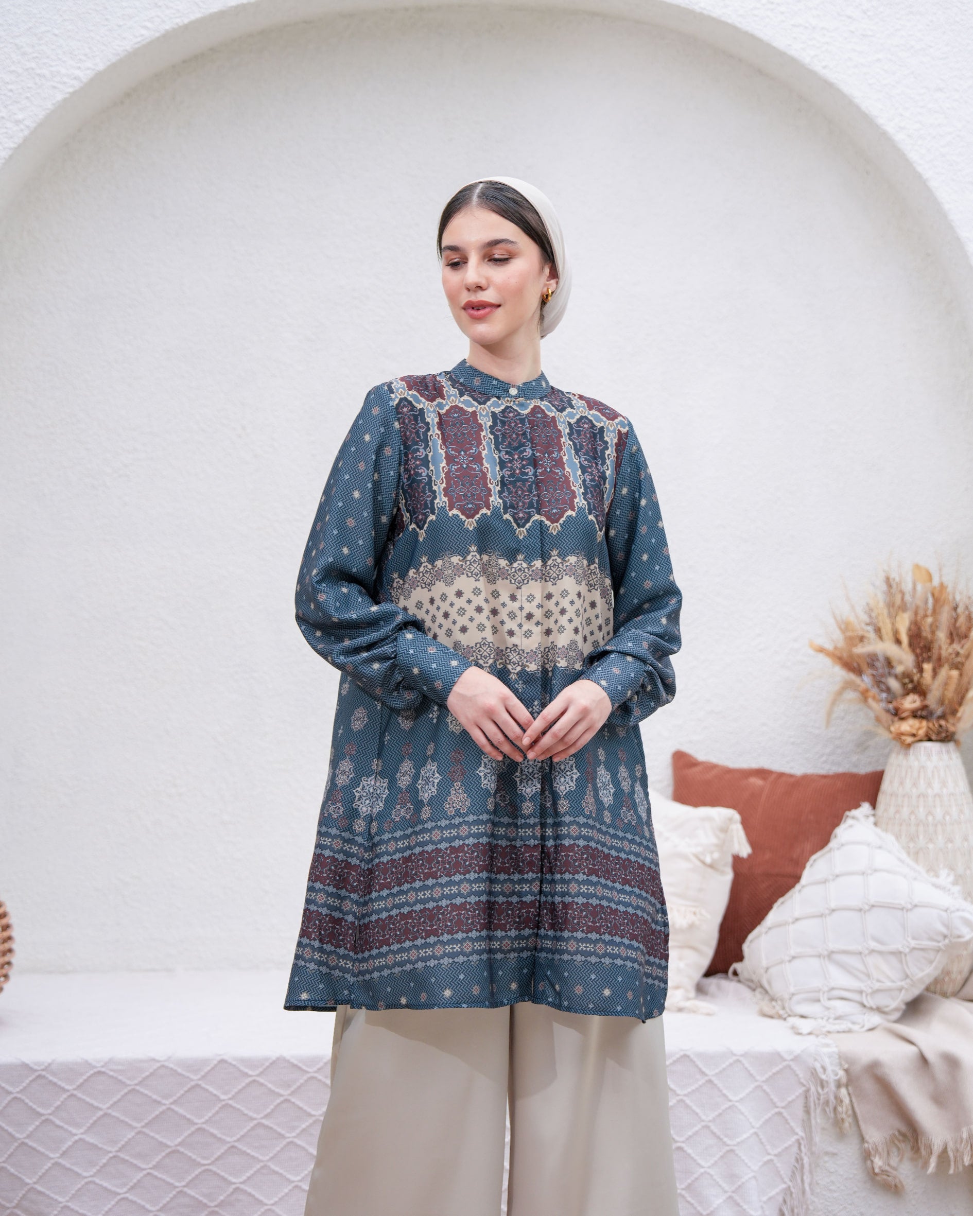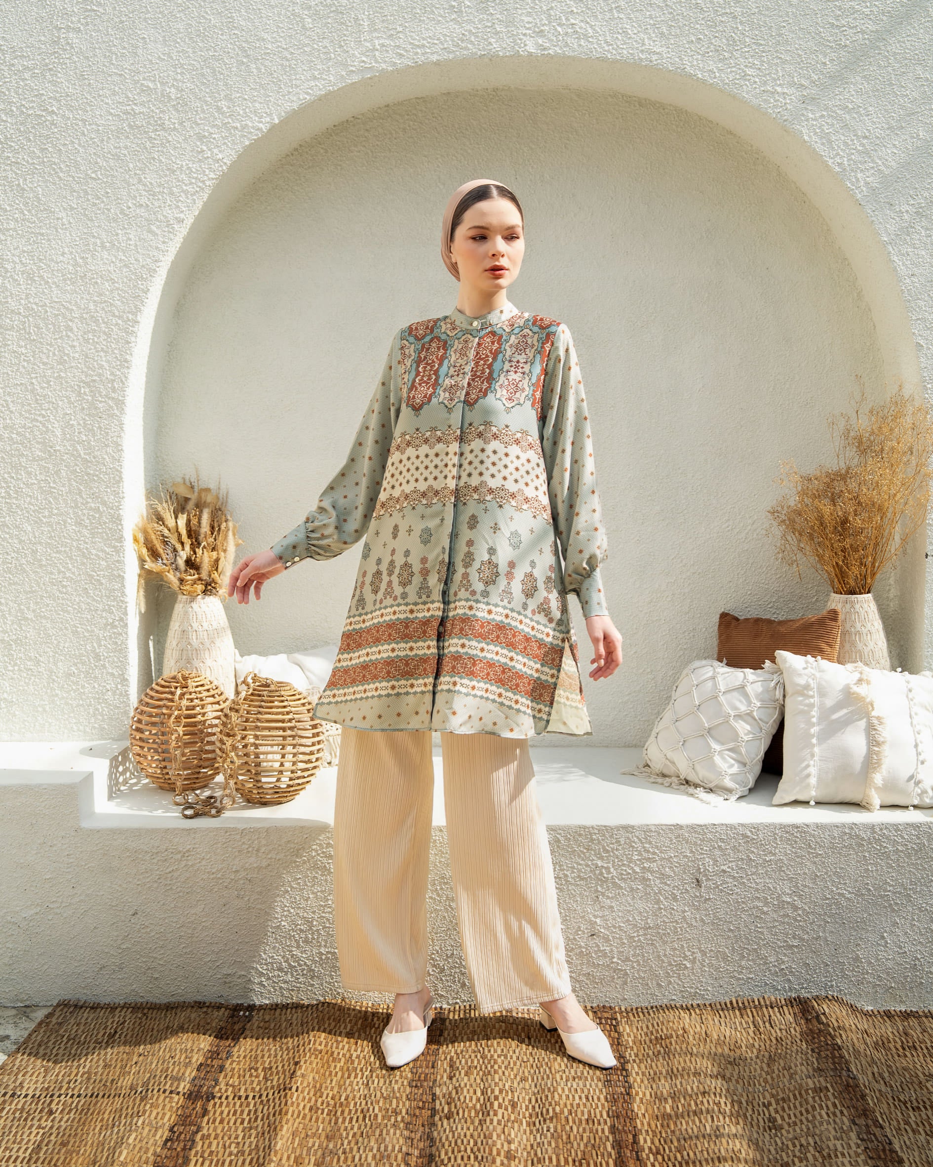 Kian memesona dengan Naraya Tunic dari Heaven Lights. Koleksi tunik printed dengan perpaduan siluet regular fit, sentuhan warna elegan, dan motif klasik yang kontras. Tampil cantik dengan perpaduan front zip dan puff sleeve. Sempurna untuk temani momen Raya.