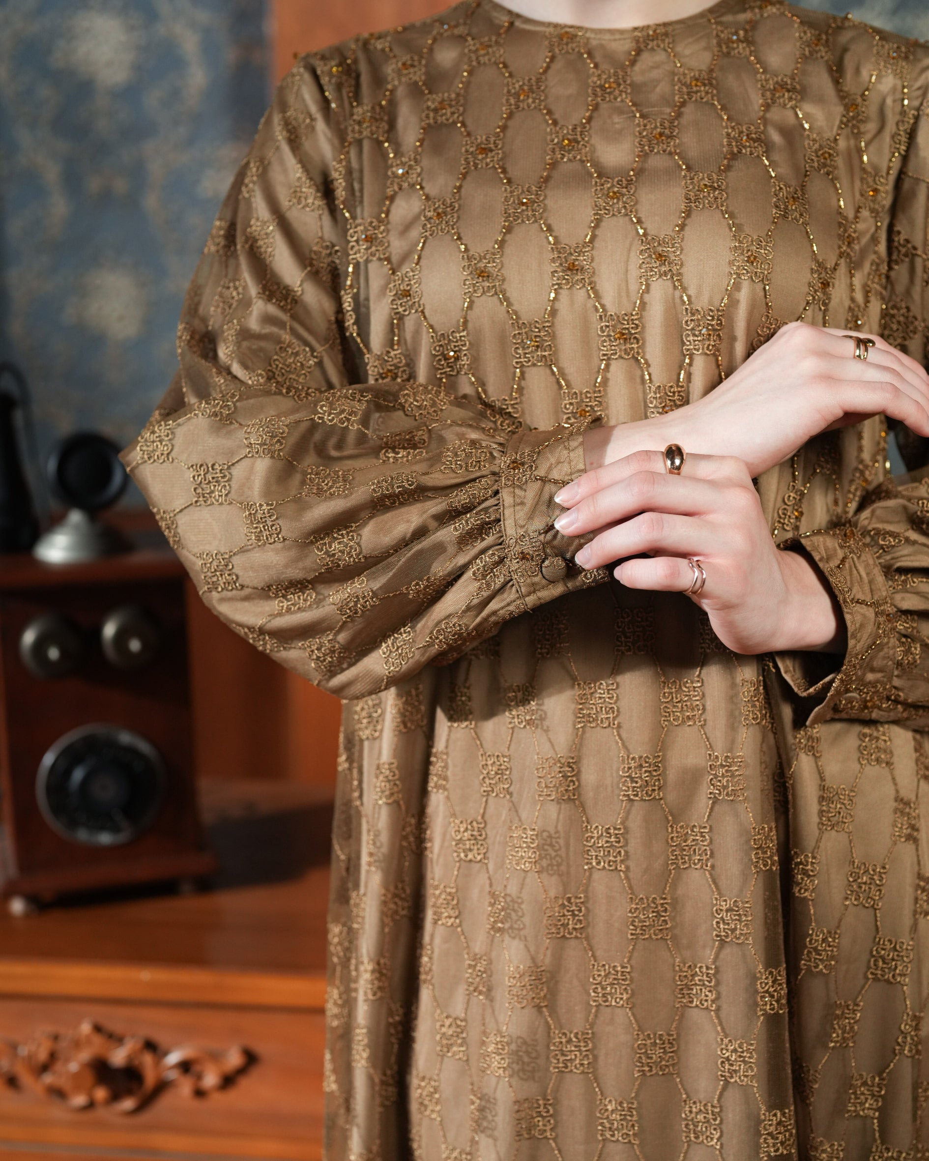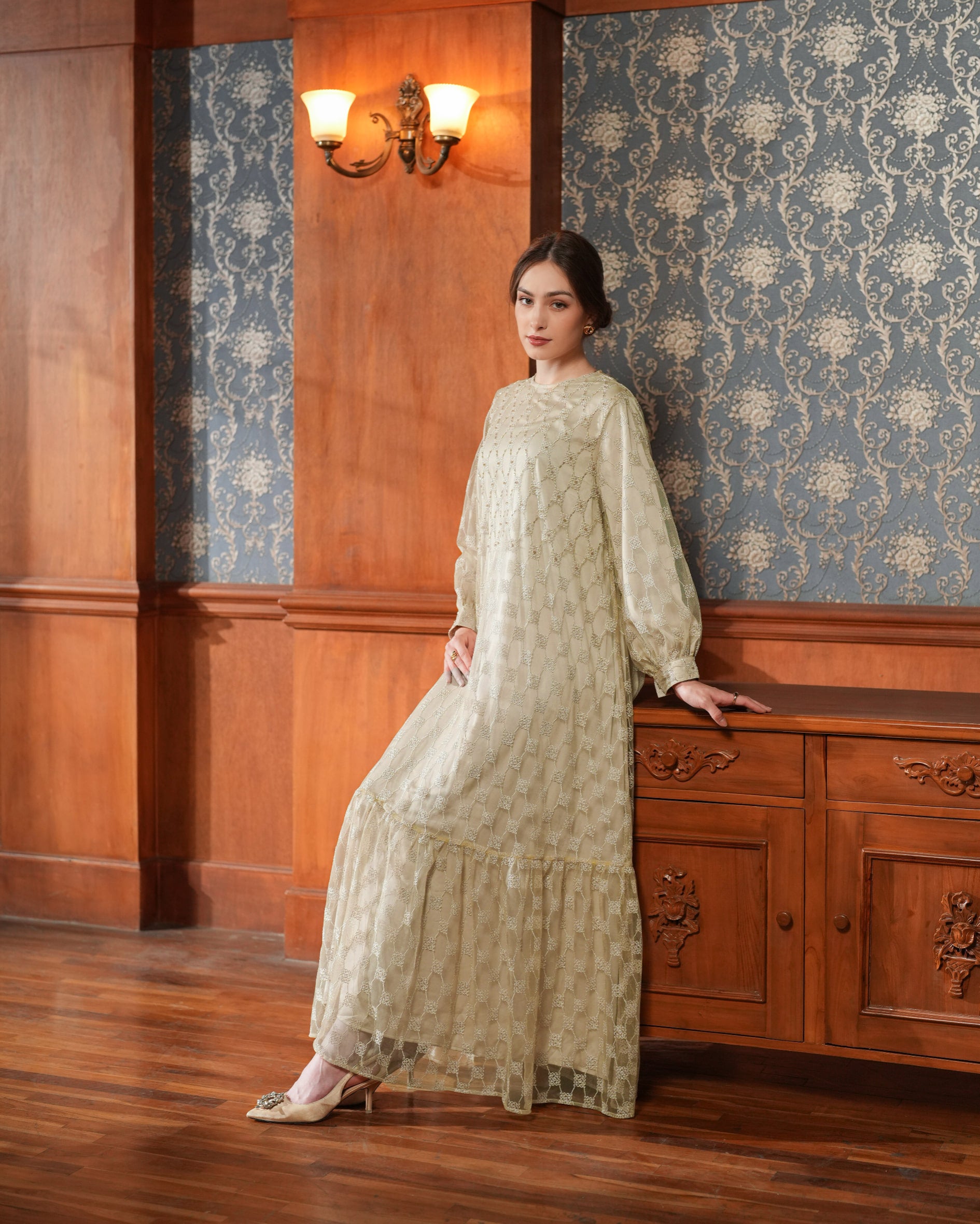 Sophisticated Pieces for Sophisticated you! Aveline Dress dari Heaven Lights Prive, long dress dengan kombinasi aplikasi laces dengan perpaduan detail resleting belakang, sentuhan monogram, ruffle accent, dan aksen dual-layer cantik. Bahannya sangat ringan, nyaman, tidak panas, dan anti kusut, karena lining senadanya sangat ringan dan lembut. Tampil dengan siluet a-line yang nyaman untuk momen istimewa.
