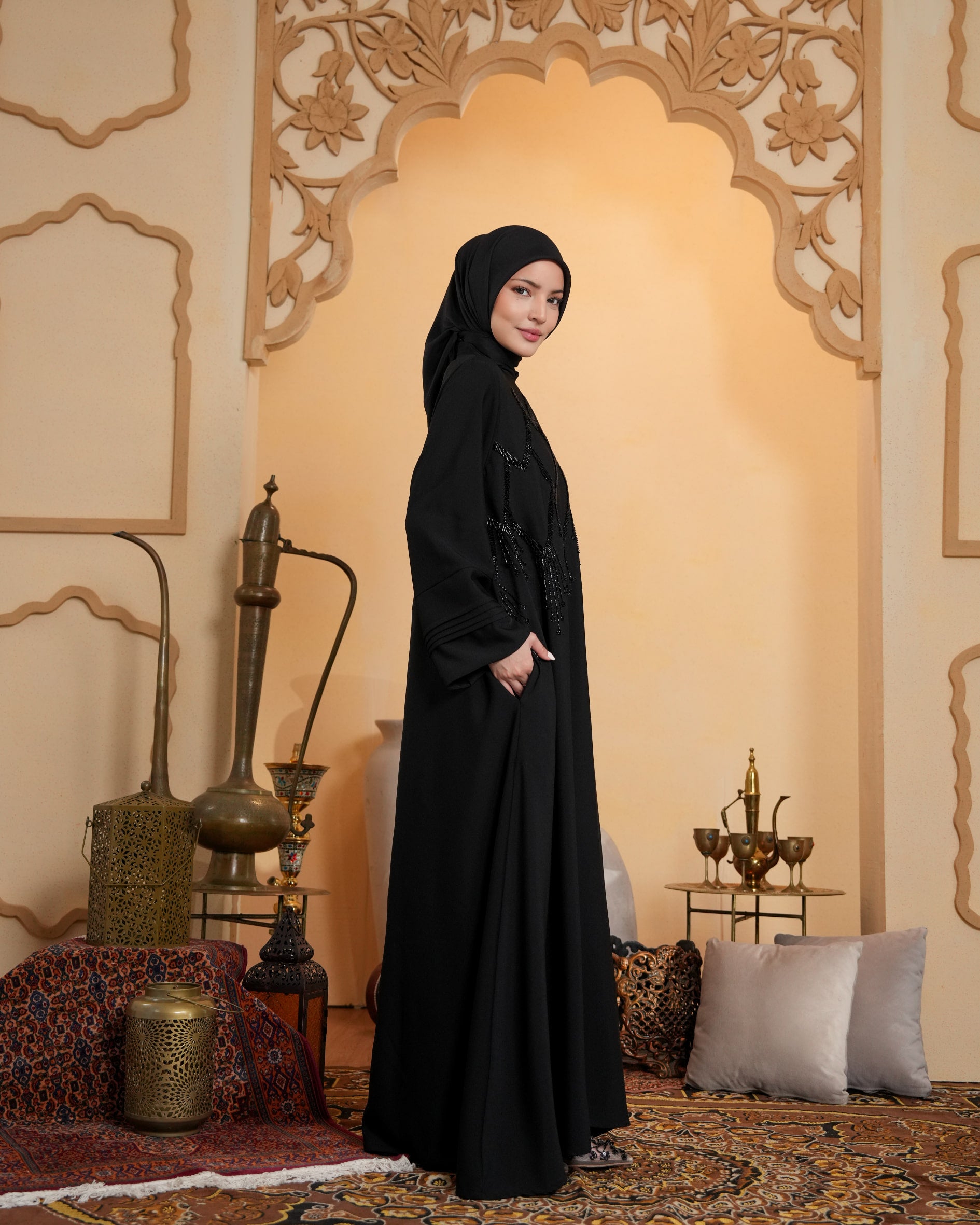 Abaya polos yang memadukan aksen front beads mewah pada bagian dada, siluet a-line yang flowy, nyaman, dan ringan, dilengkapi detail resleting belakang dan aksen band sleeve.