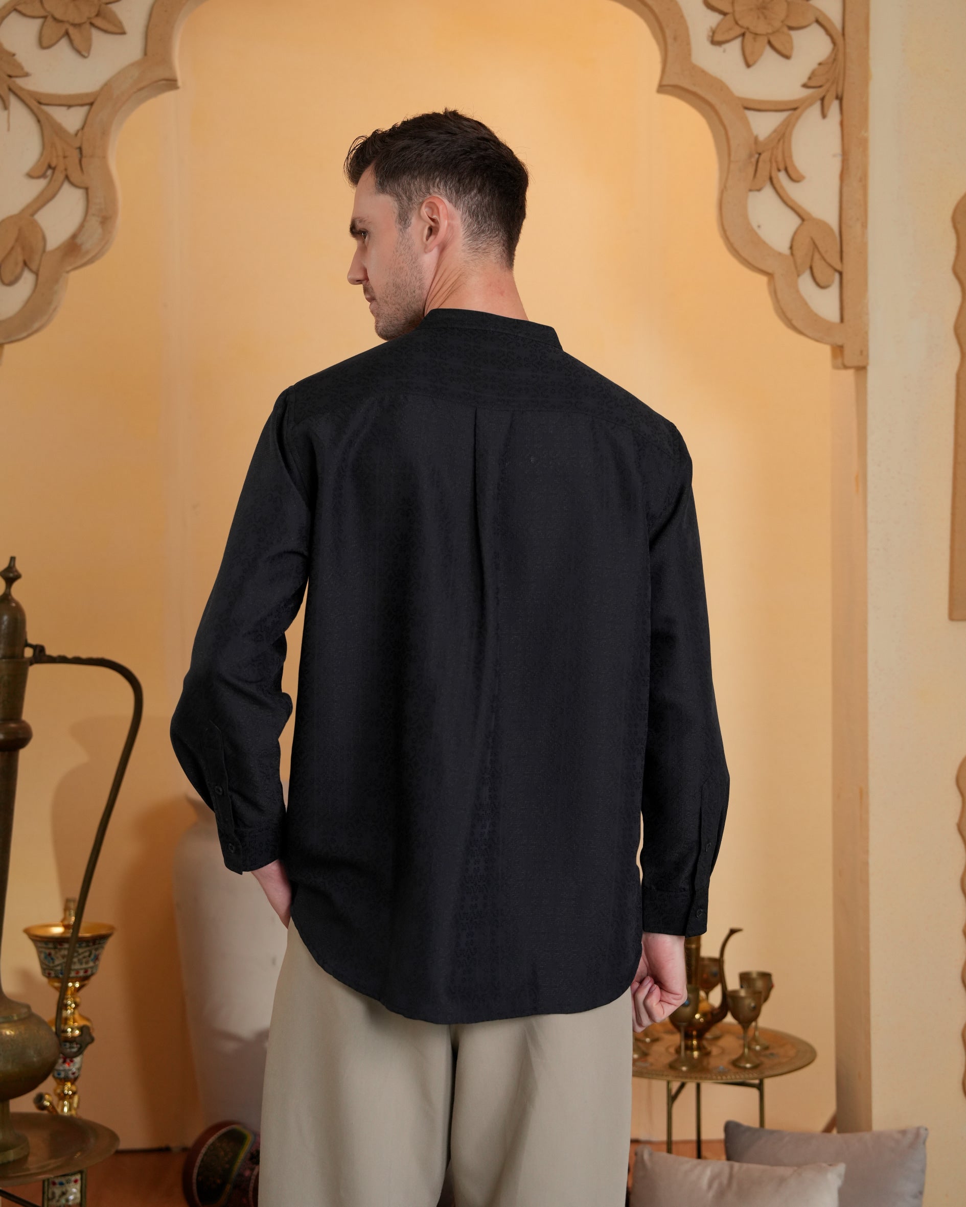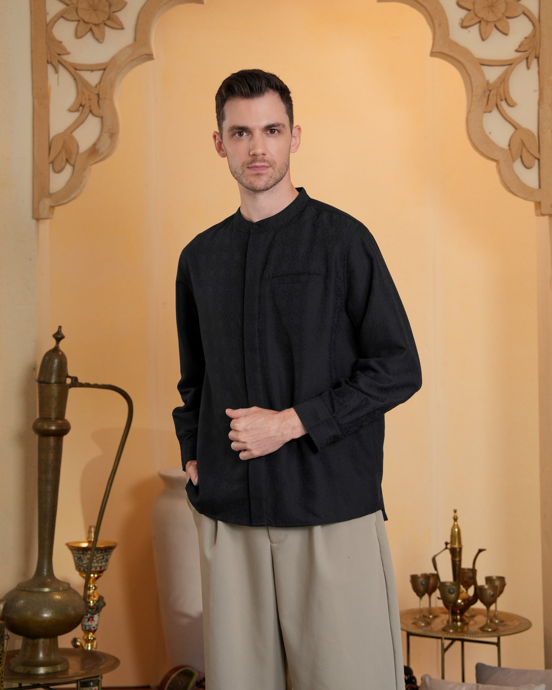 Baju koko lengan panjang dengan perpaduan conceal button, kerah bulat, siluet regular fit, sentuhan warna klasik, dan emboss yang elegan. Sempurna untuk temani momen Raya dan momen spesial lainnya.