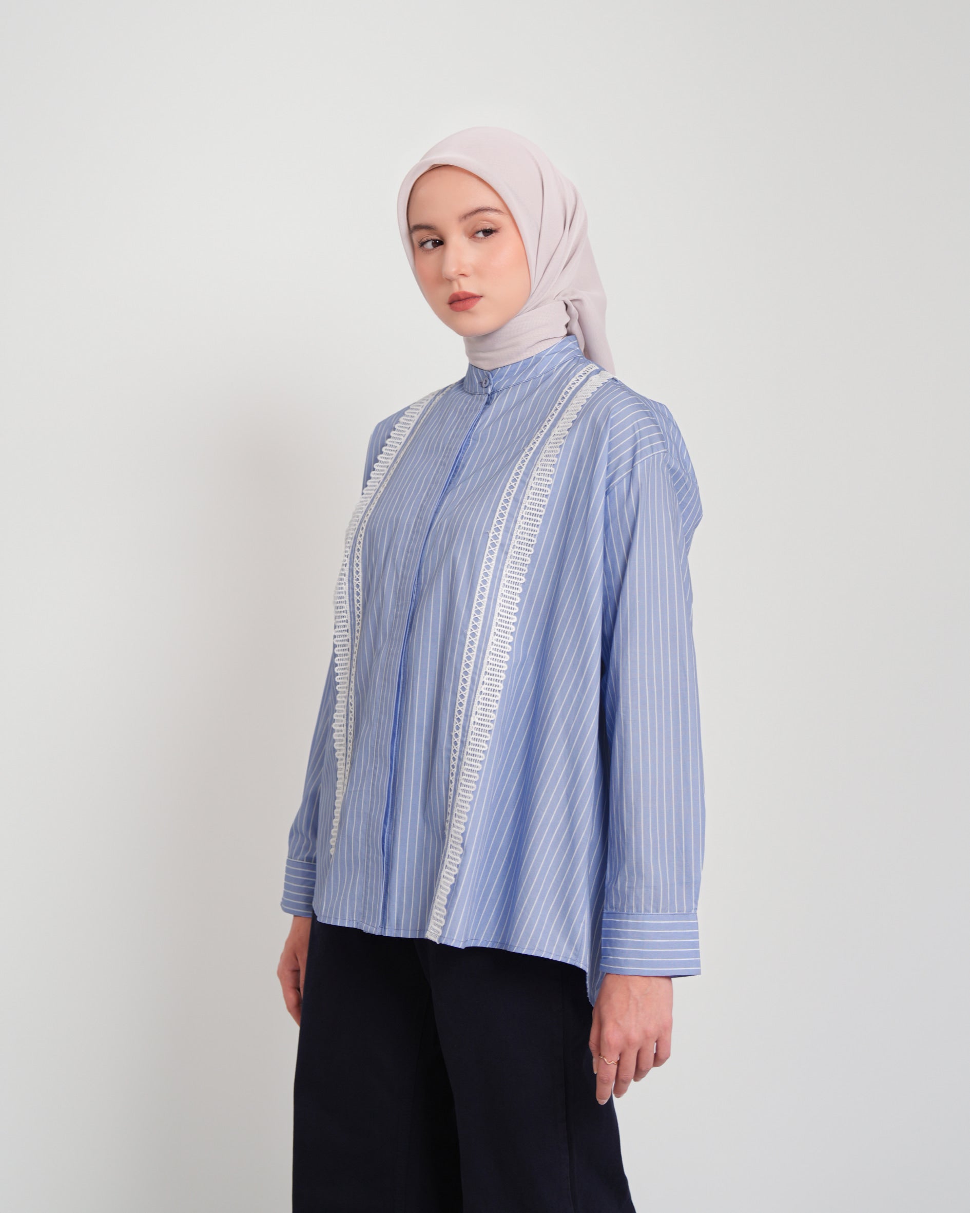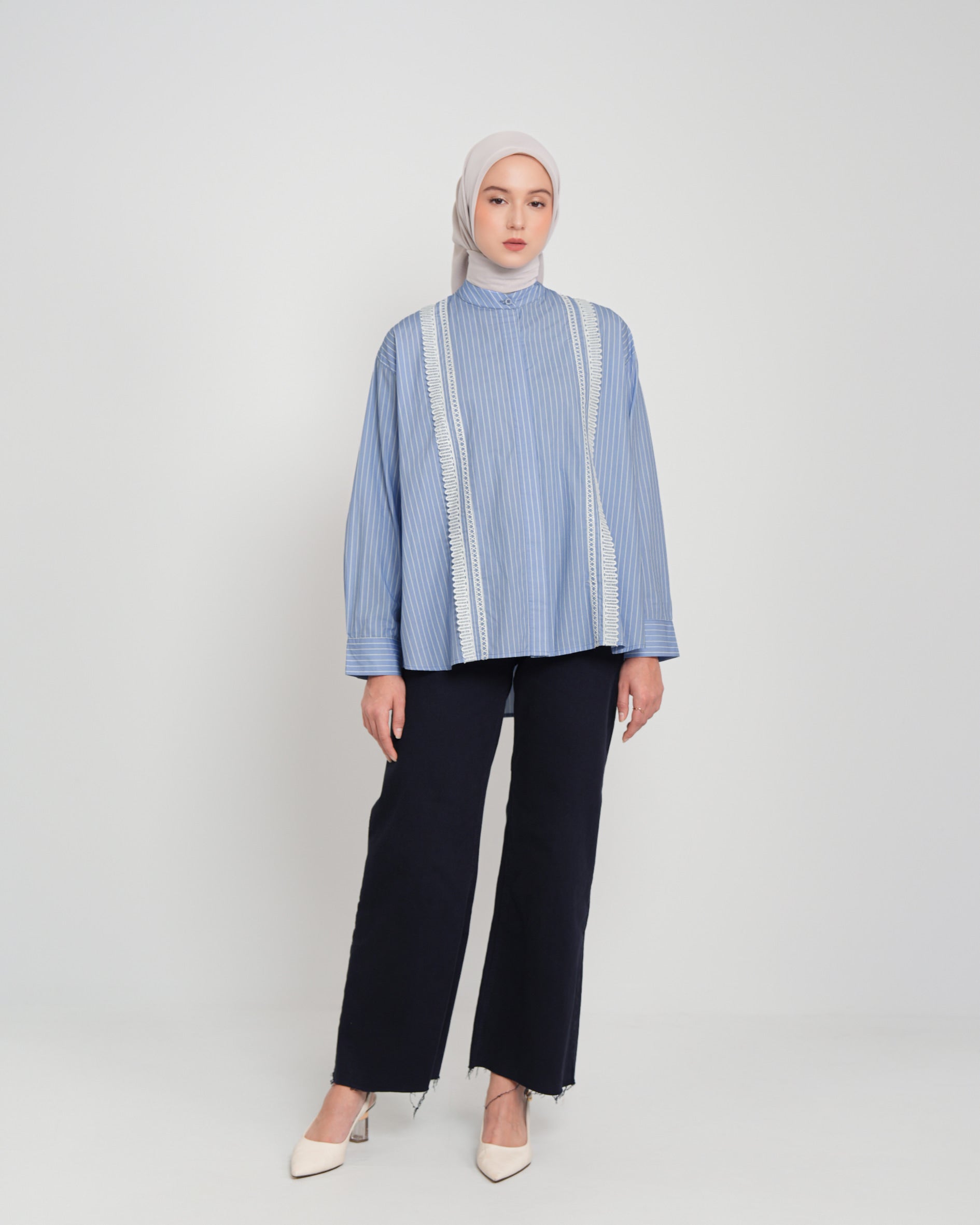New daily stripe shirt! Gretha Shirt dari Heaven Lights tampil chic dengan full kancing bagian depan yang busui friendly, kerah bulat, aksen laces, dan motif garis yang cantik. Bahannya yang ringan, lembut, tidak gampang kusut, dan pastinya nyaman untuk dipakai sehari-hari.