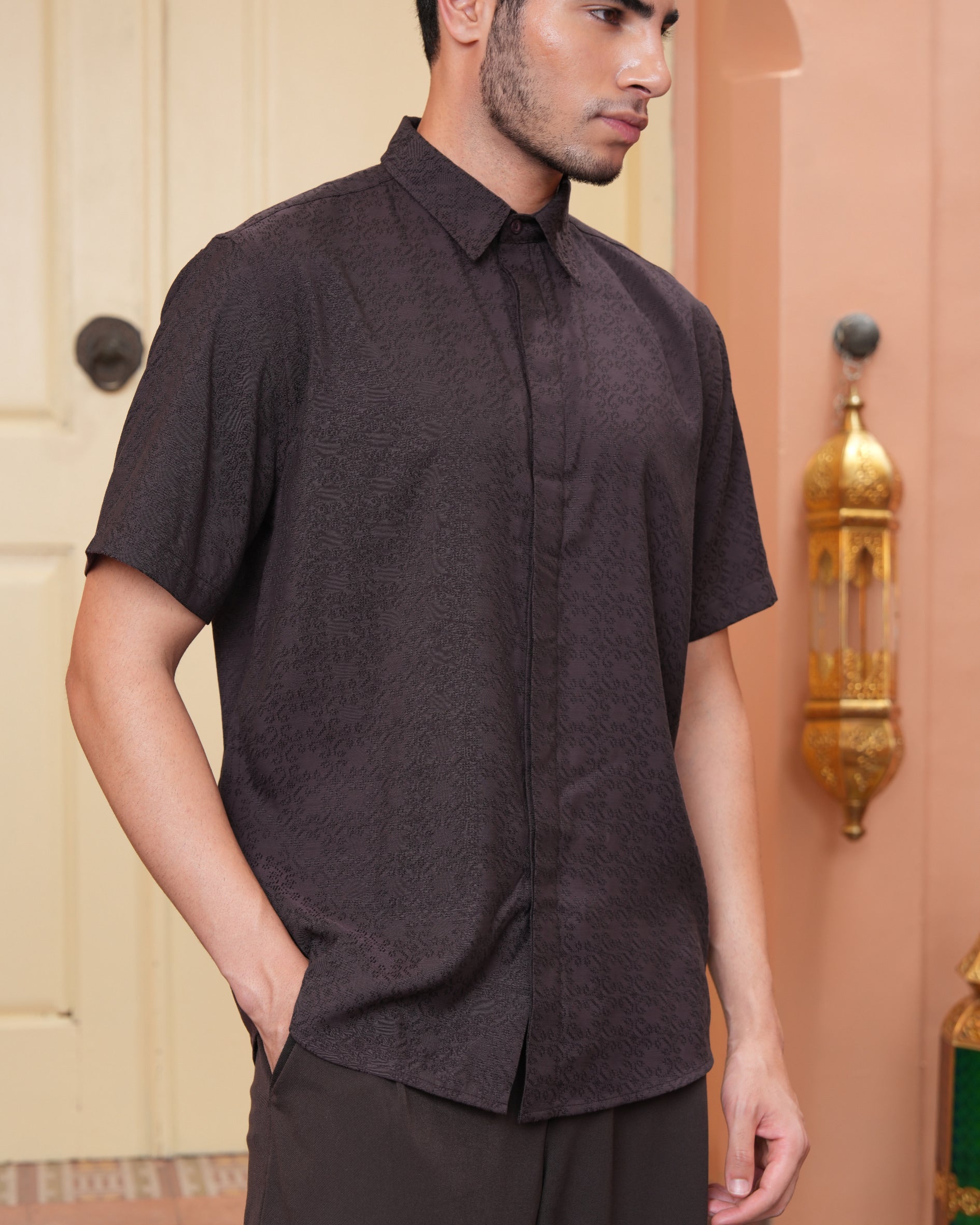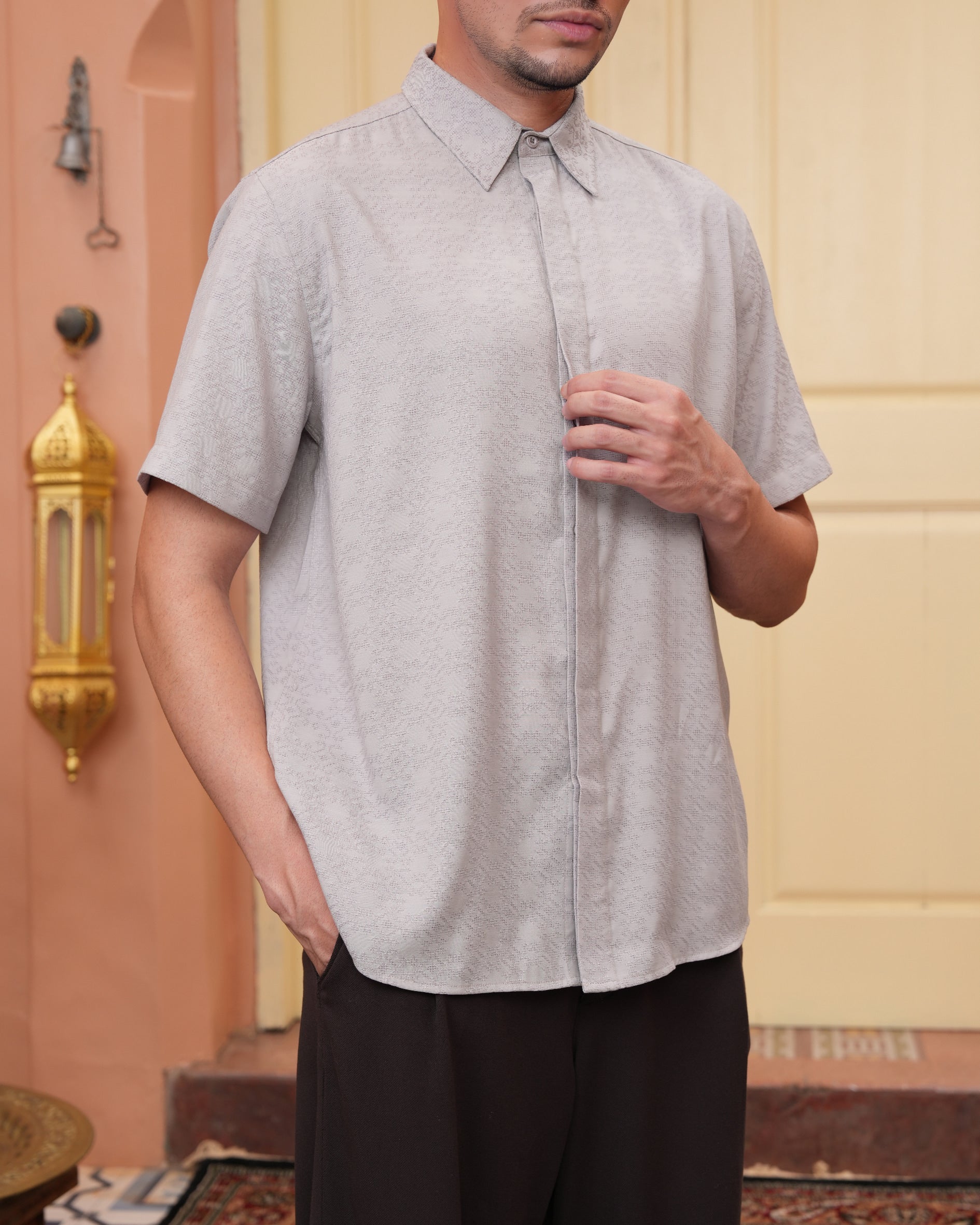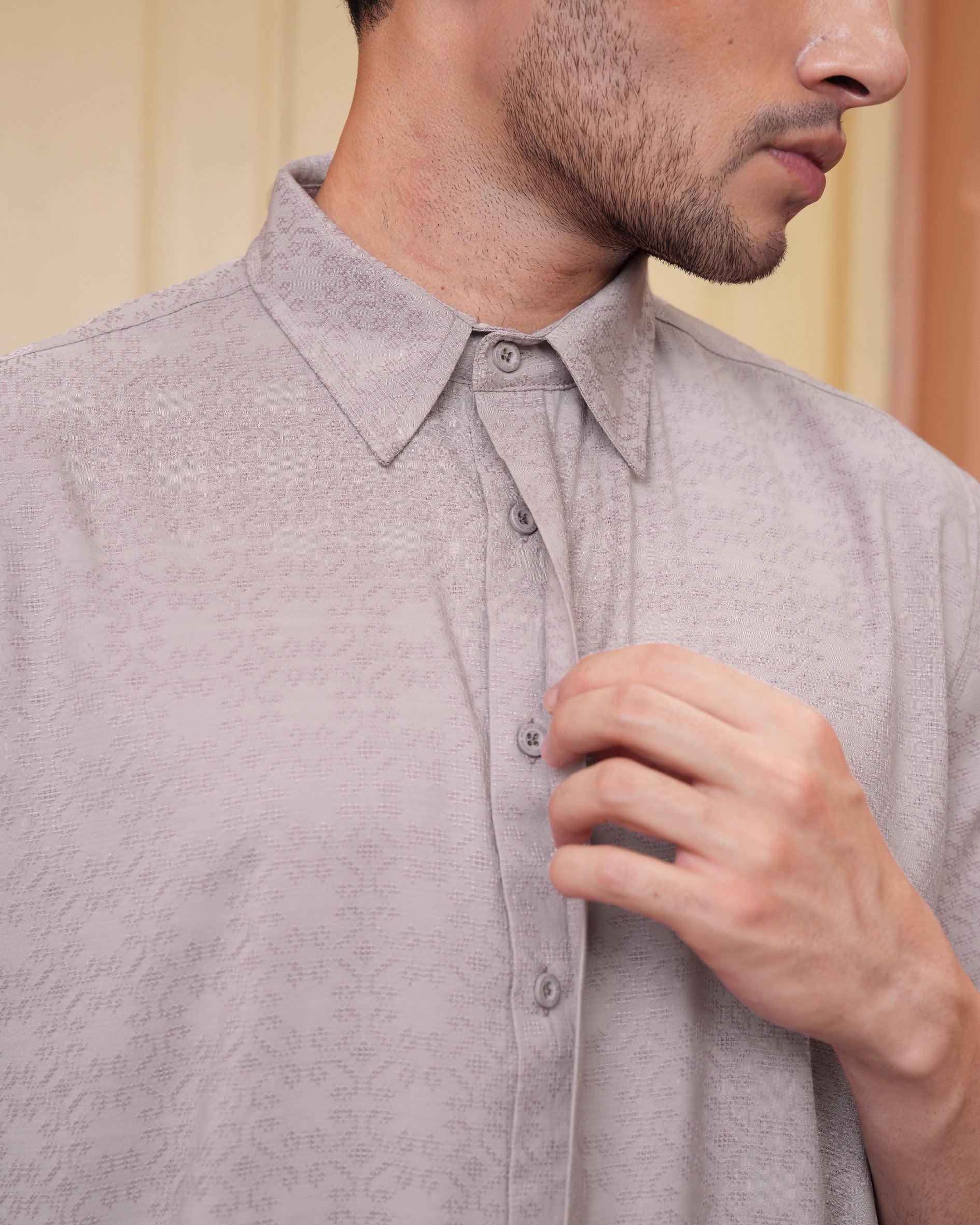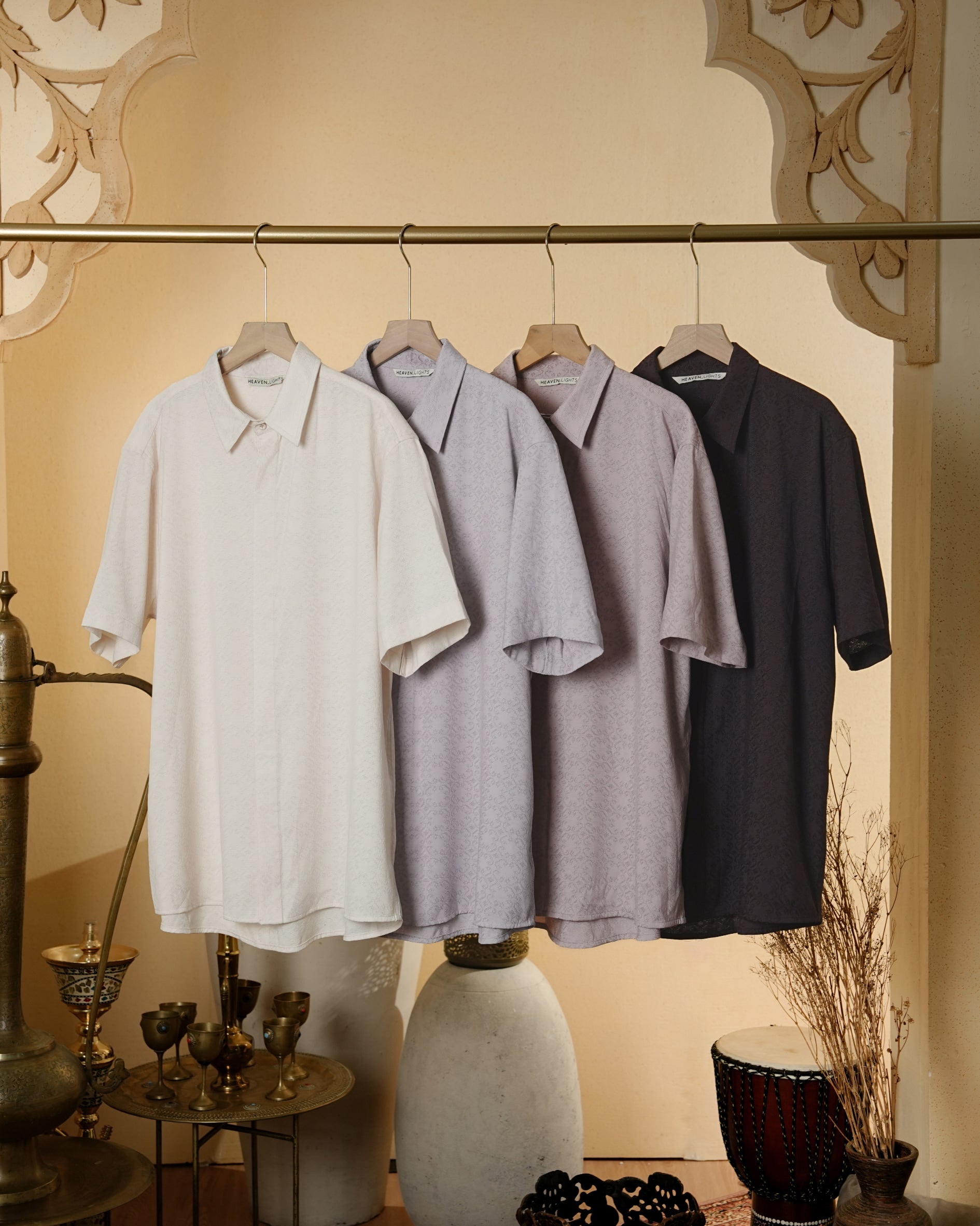 Senara Koko dari Heaven Lights. Koleksi baju koko lengan pendek dengan perpaduan conceal button, kerah kemeja, siluet regular fit, sentuhan warna klasik, dan motif yang elegan. Sempurna untuk temani momen Raya dan momen spesial lainnya.