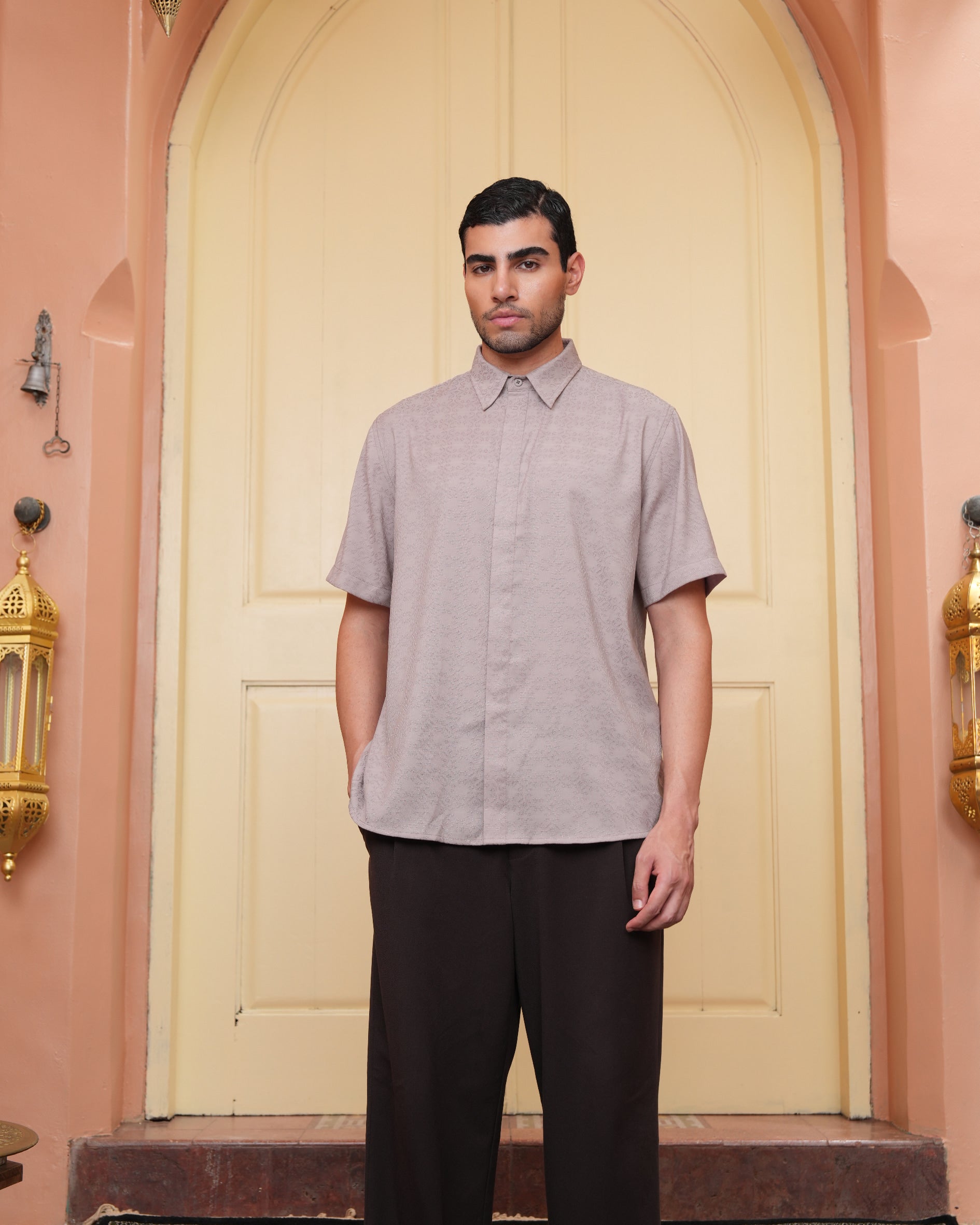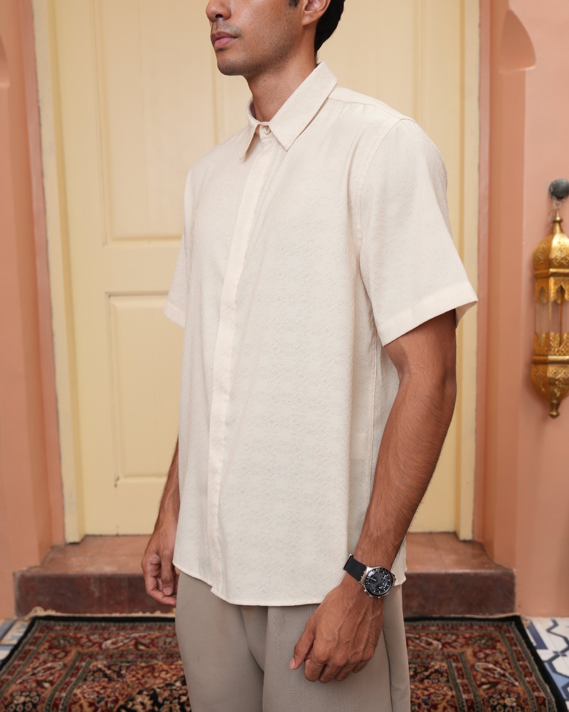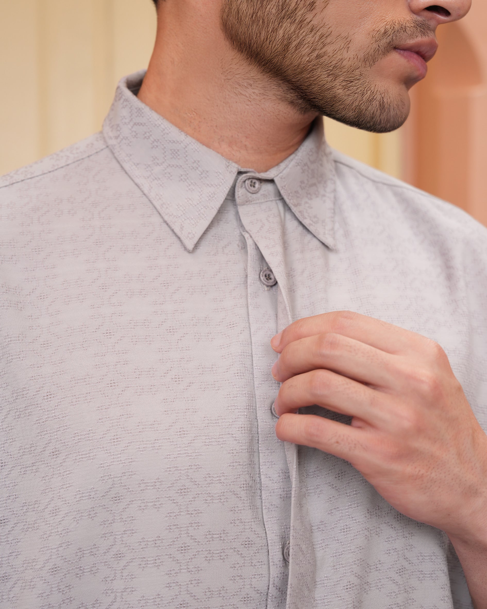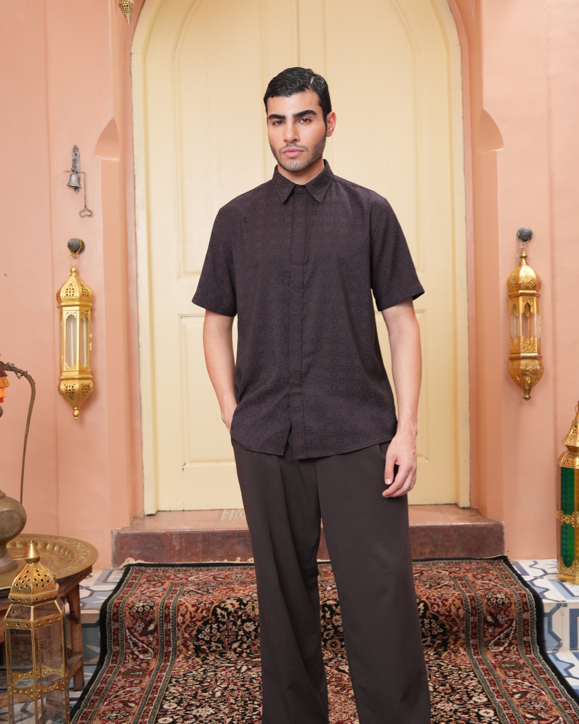 Senara Koko dari Heaven Lights. Koleksi baju koko lengan pendek dengan perpaduan conceal button, kerah kemeja, siluet regular fit, sentuhan warna klasik, dan motif yang elegan. Sempurna untuk temani momen Raya dan momen spesial lainnya.