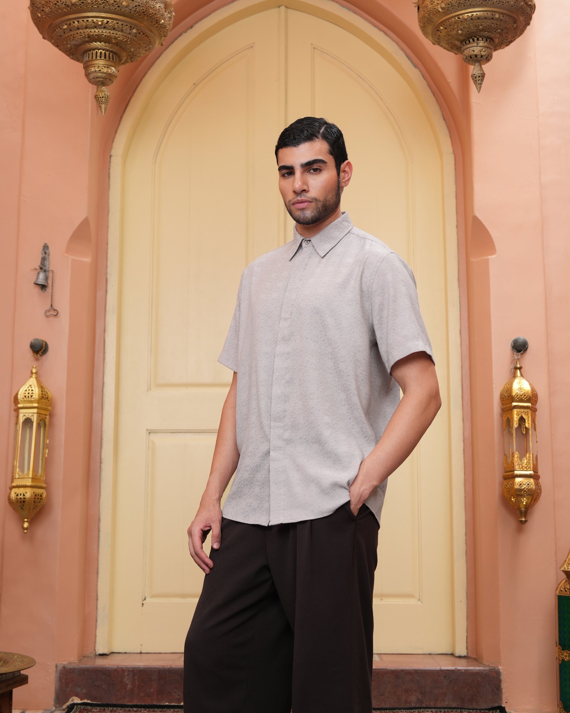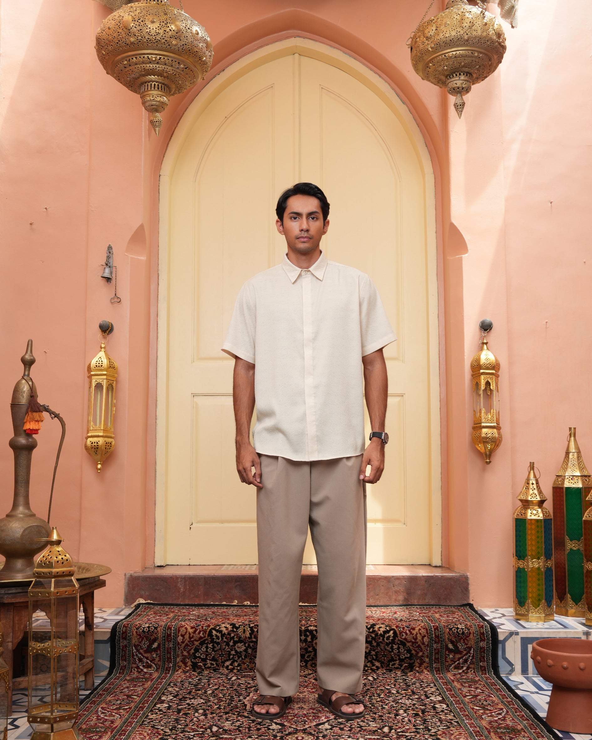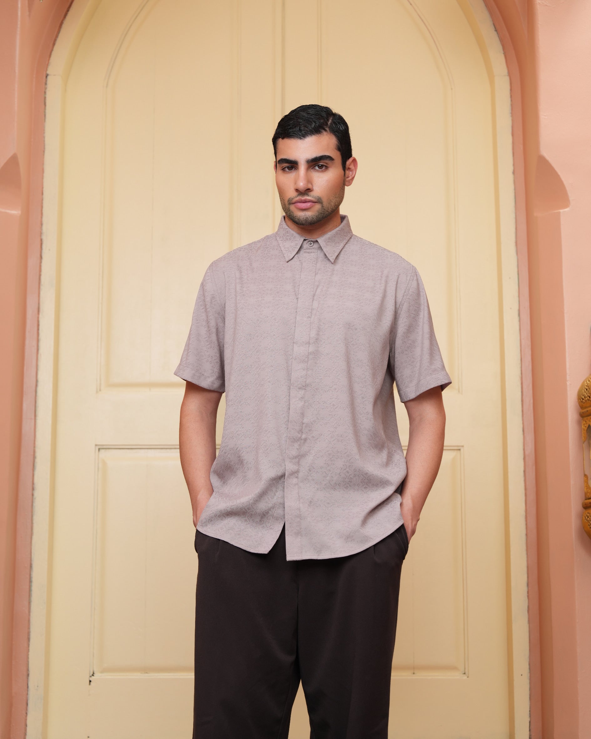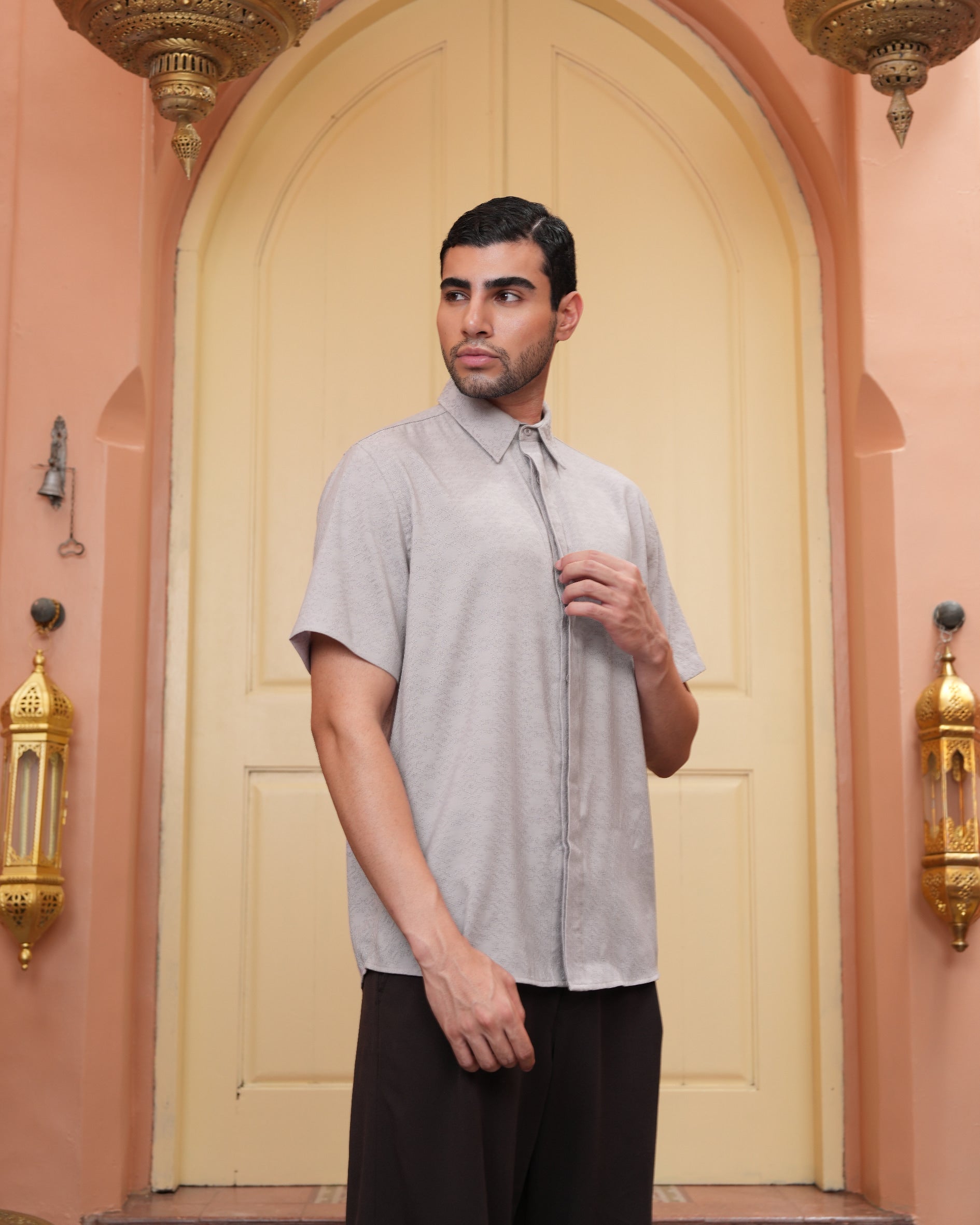 Senara Koko dari Heaven Lights. Koleksi baju koko lengan pendek dengan perpaduan conceal button, kerah kemeja, siluet regular fit, sentuhan warna klasik, dan motif yang elegan. Sempurna untuk temani momen Raya dan momen spesial lainnya.