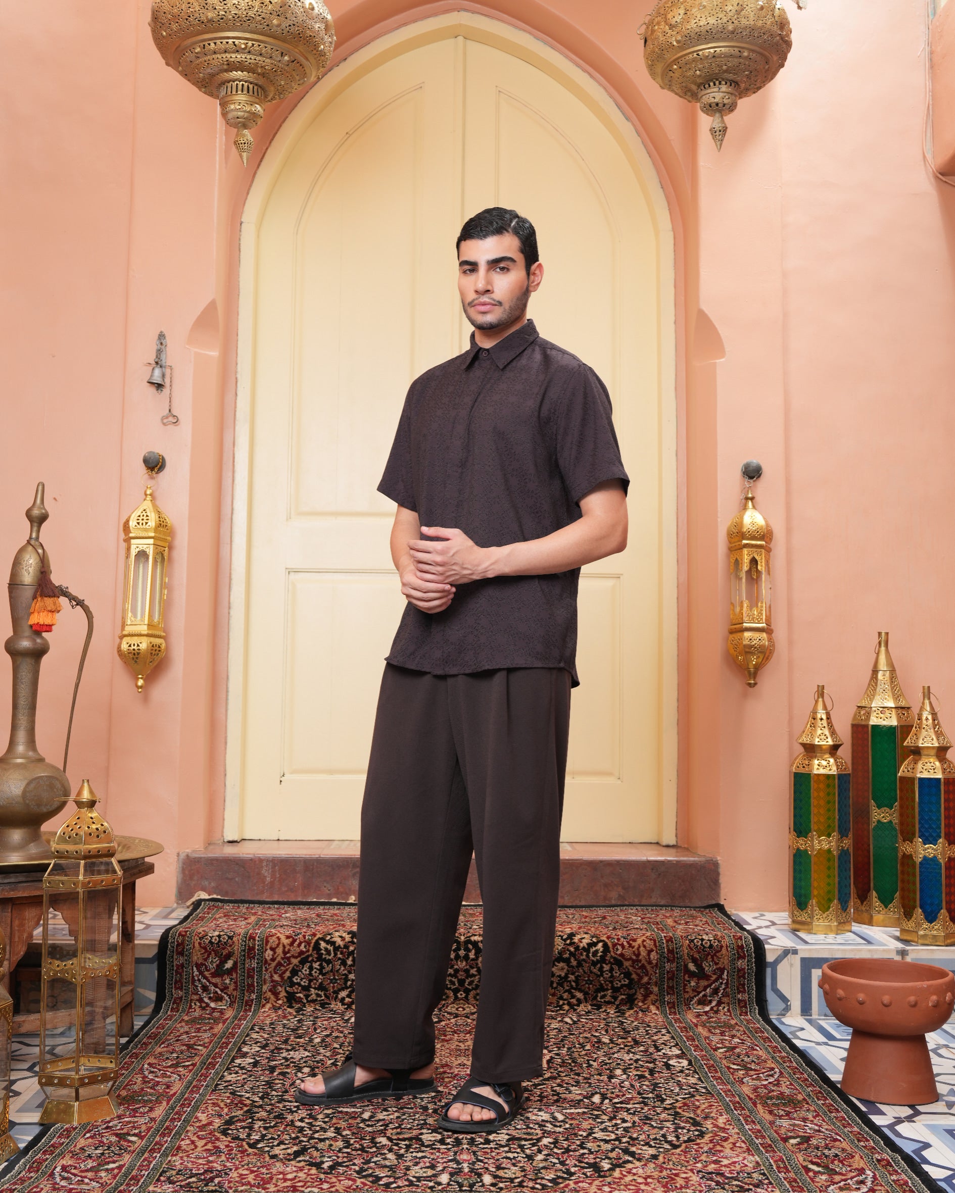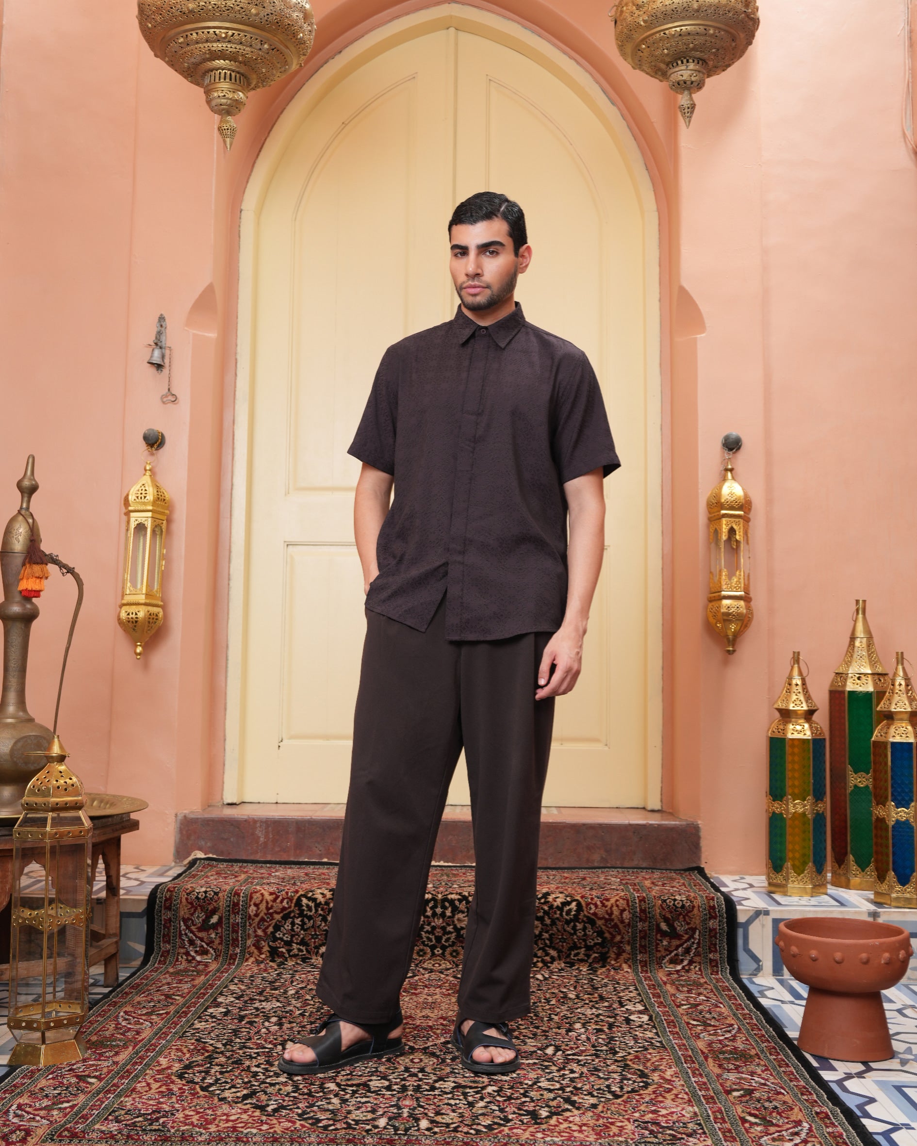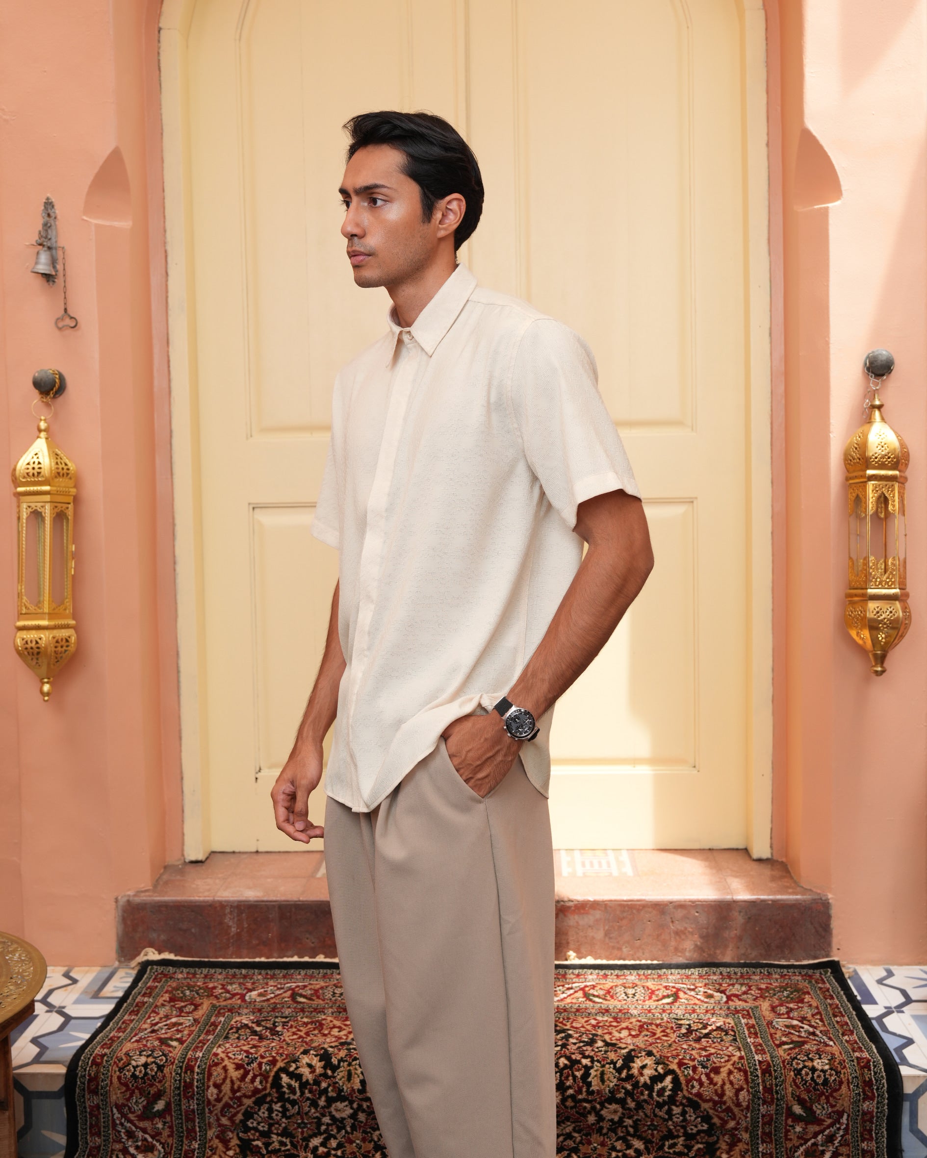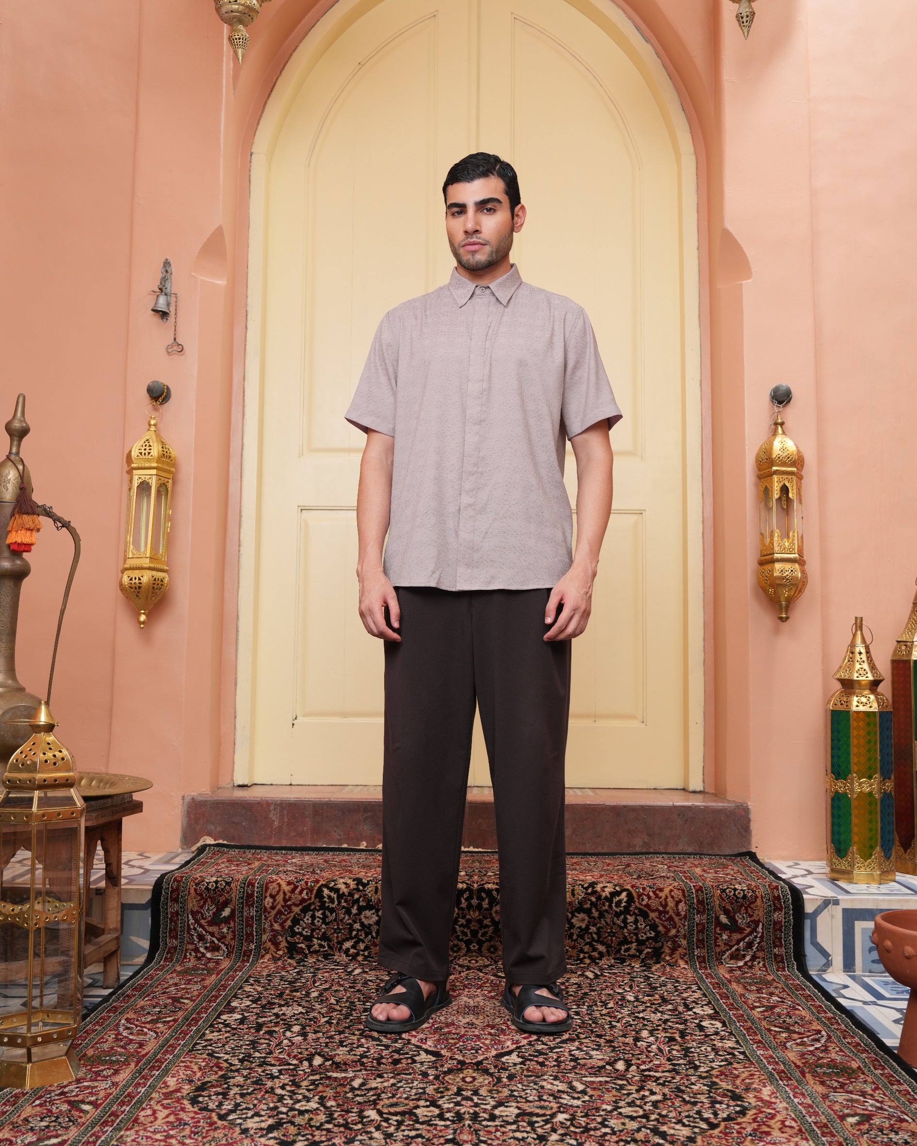 Senara Koko dari Heaven Lights. Koleksi baju koko lengan pendek dengan perpaduan conceal button, kerah kemeja, siluet regular fit, sentuhan warna klasik, dan motif yang elegan. Sempurna untuk temani momen Raya dan momen spesial lainnya.