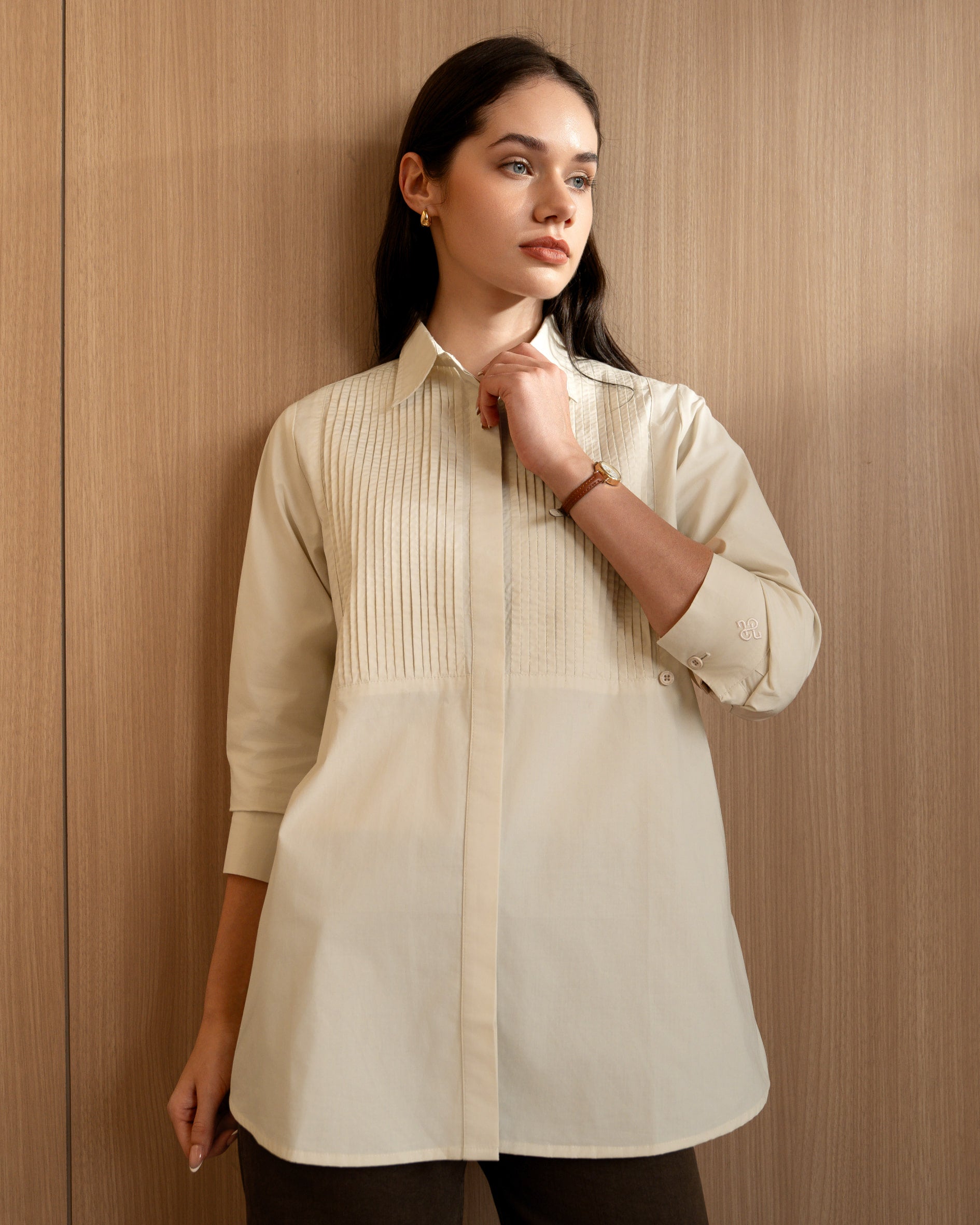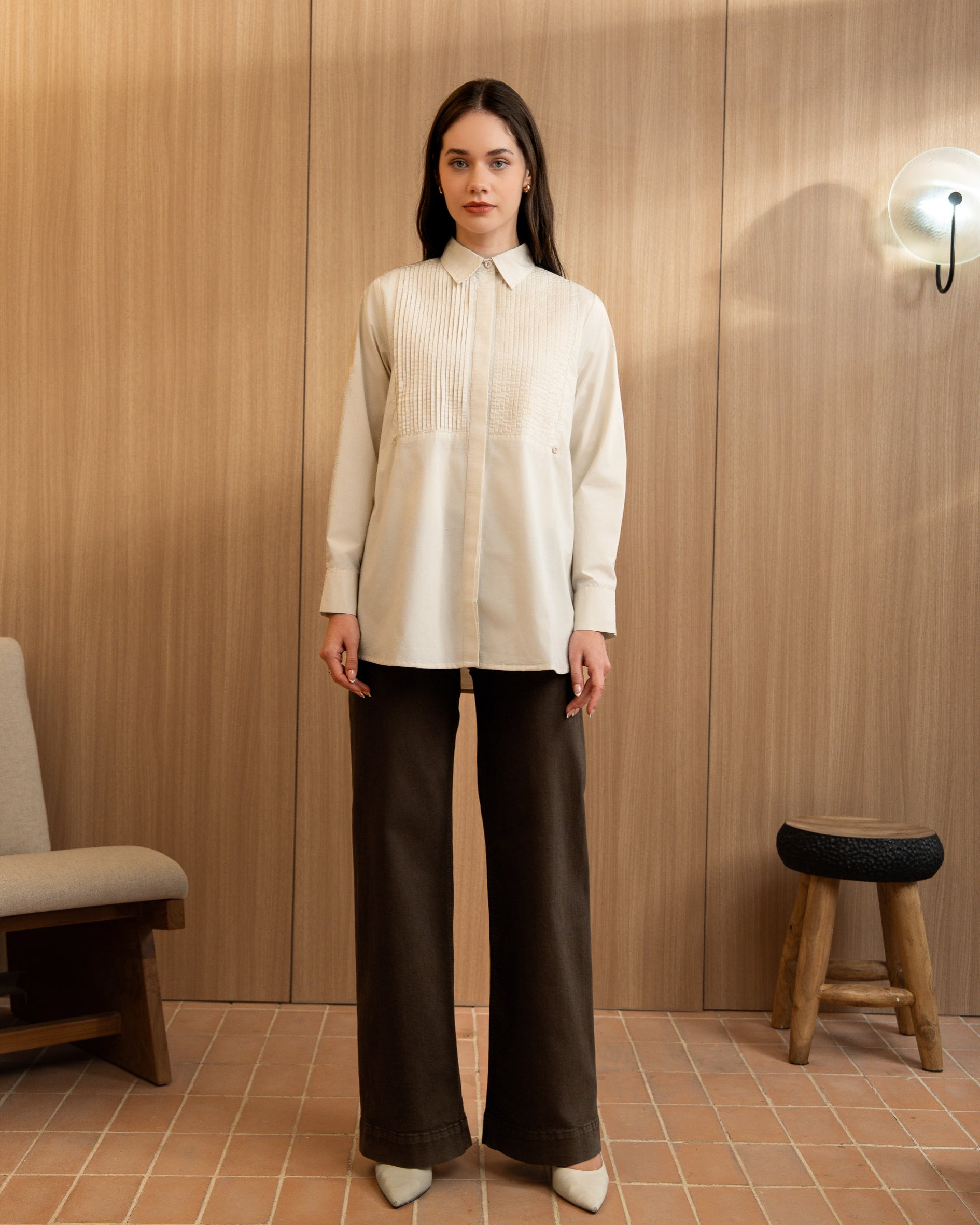 Kemeja lengan panjang dengan kombinasi detail kancing depan hidden, aplikasi opnaisel pada bagian depan, dan bahannnya ringan. Cutting-nya relaxed jadi super nyaman dan bebas bergerak seharian.