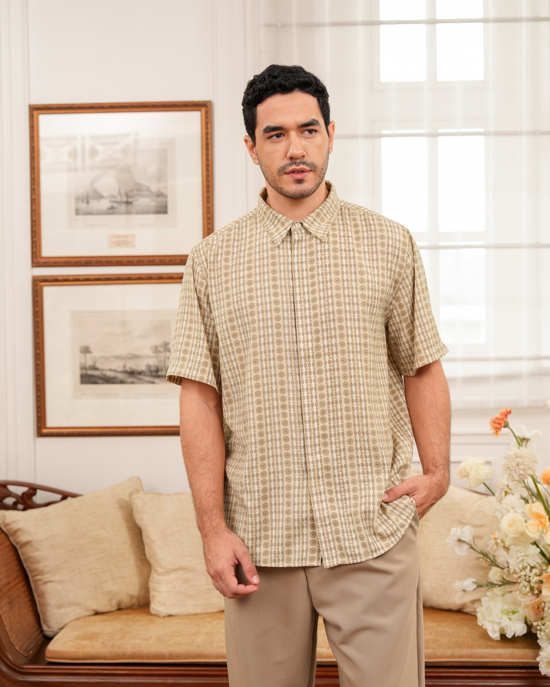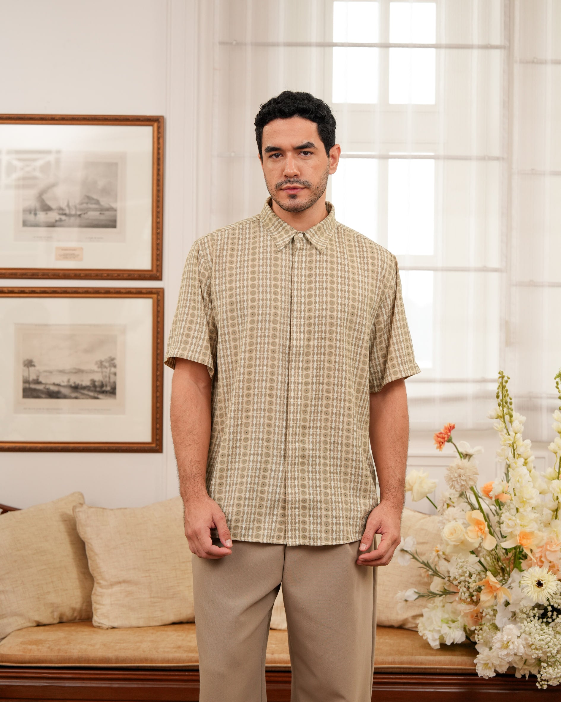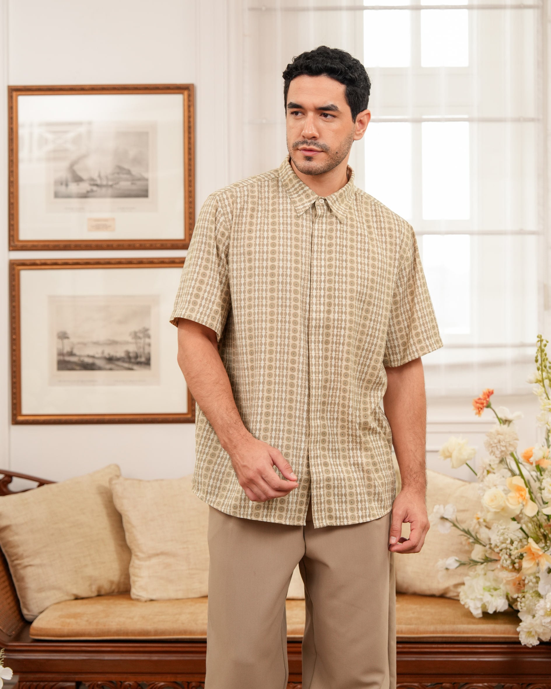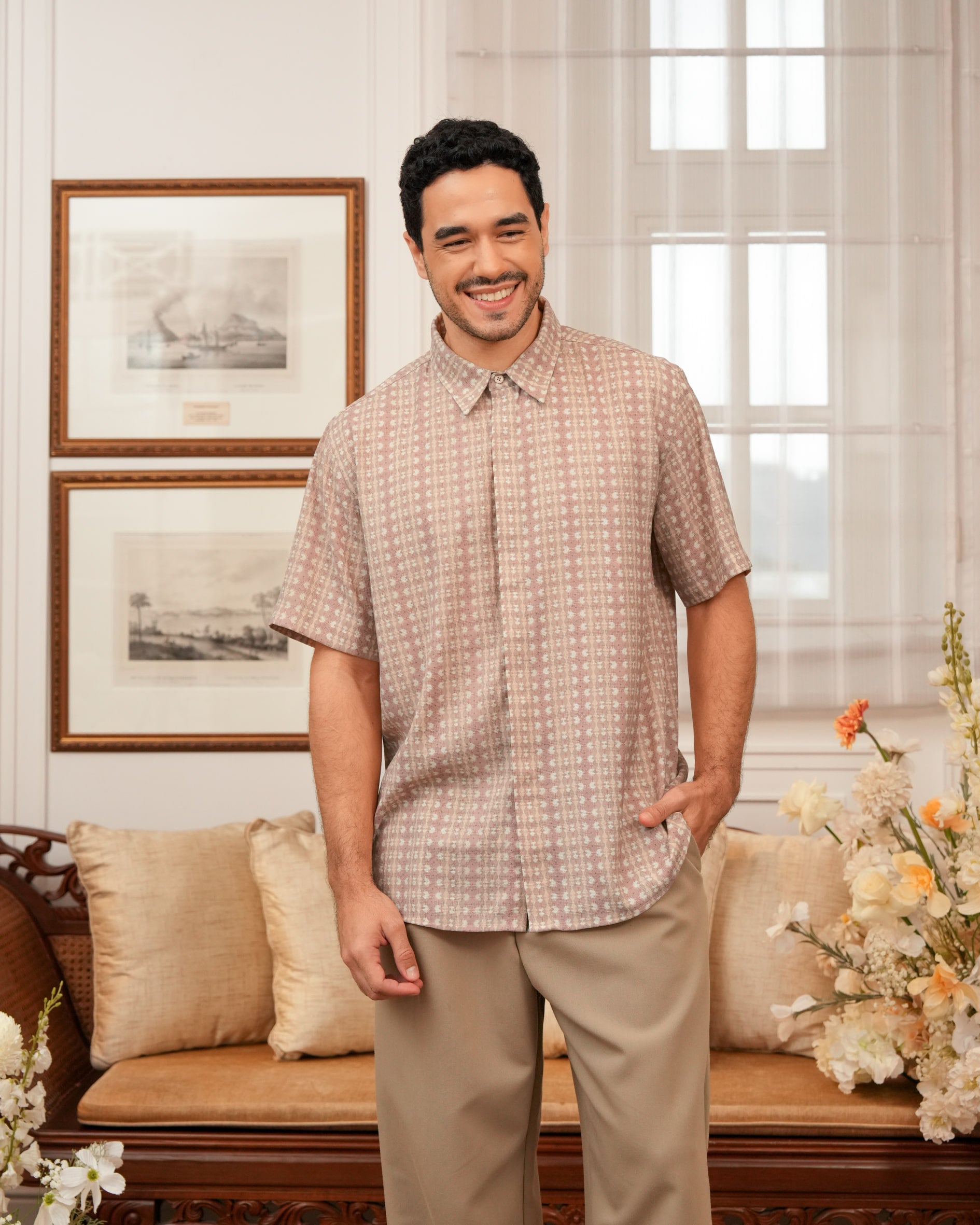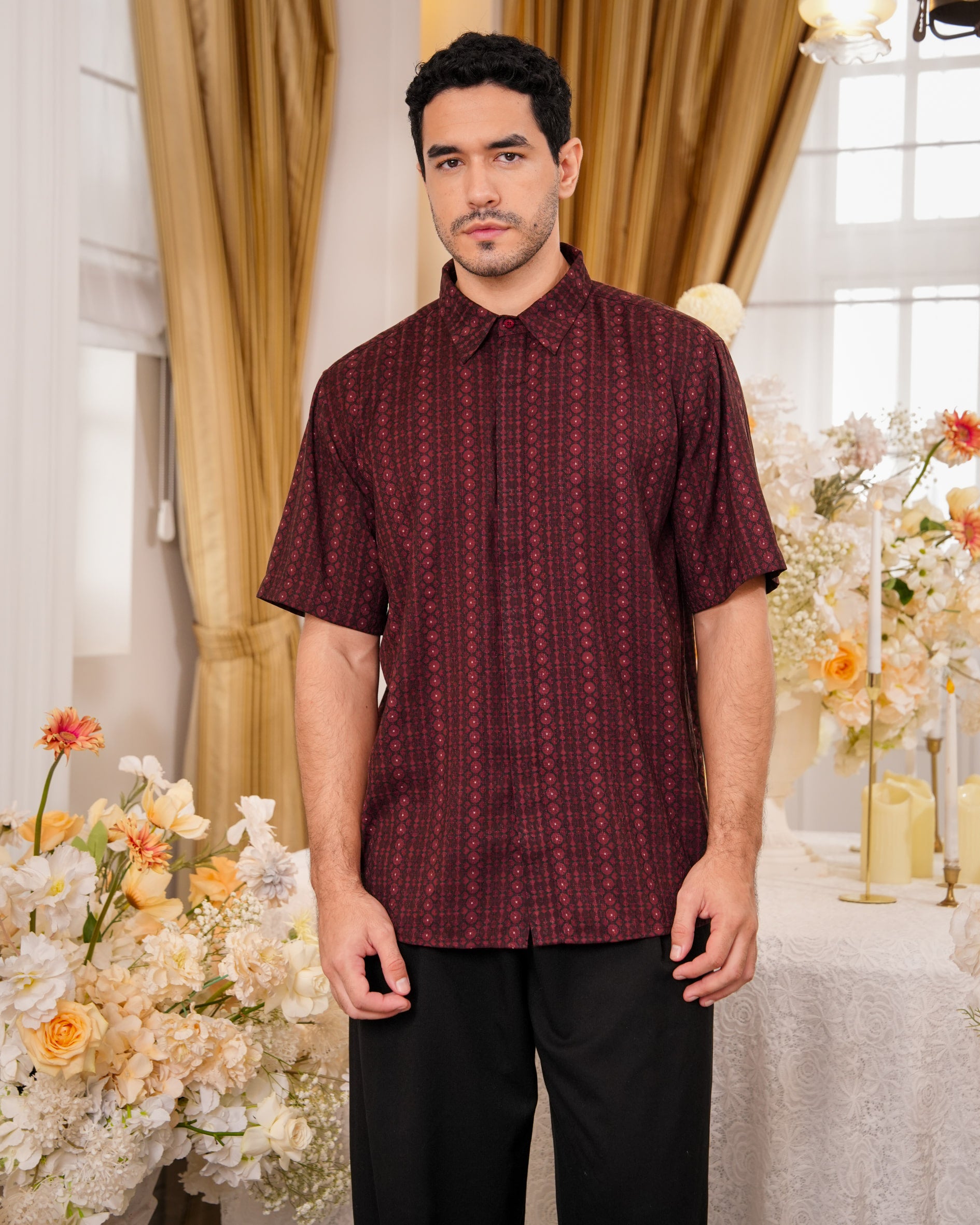 Baju koko lengan pendek dengan perpaduan conceal button, kerah kemeja, siluet regular fit, sentuhan warna klasik, dan motif yang elegan. Sempurna untuk temani momen Raya dan momen spesial lainnya.