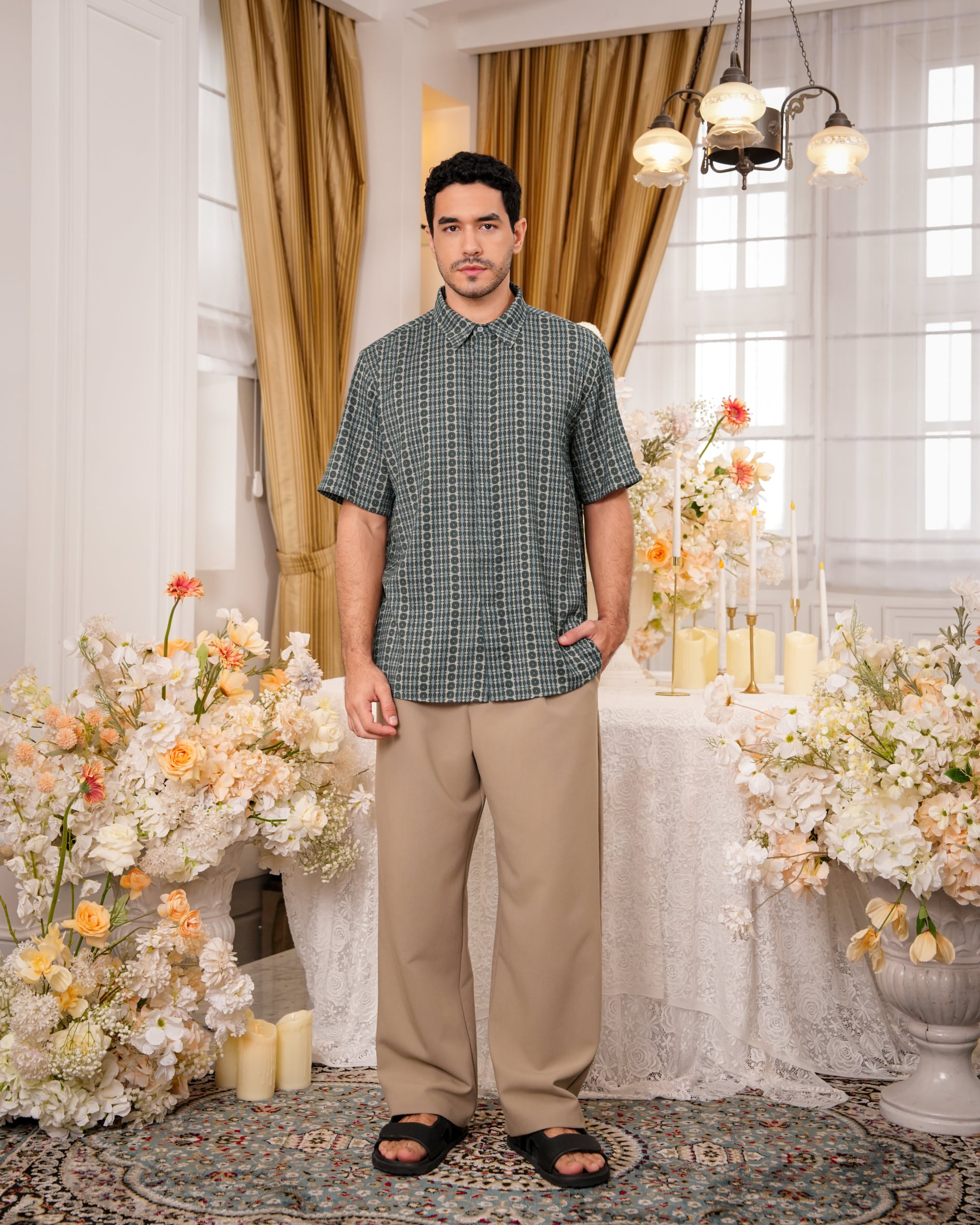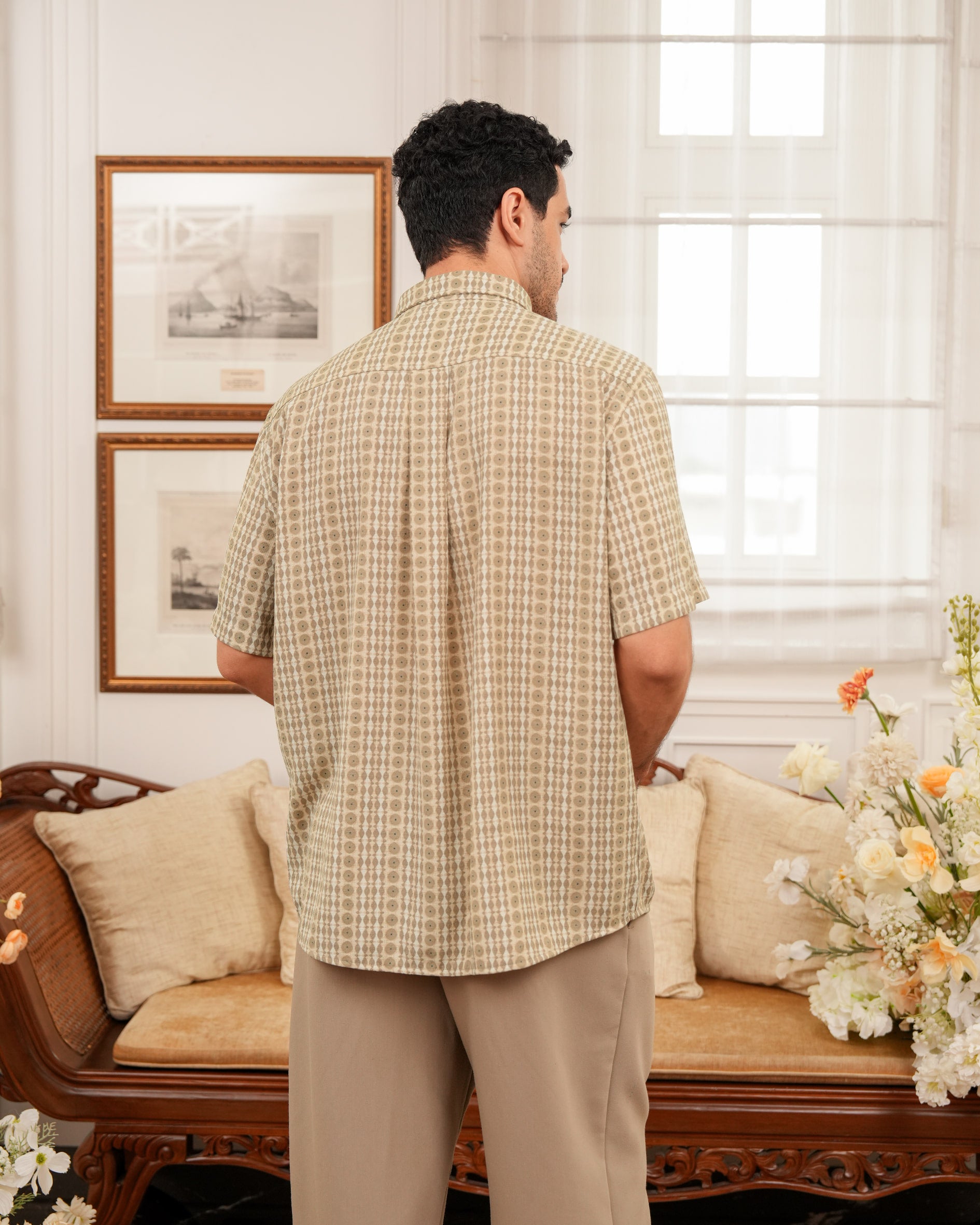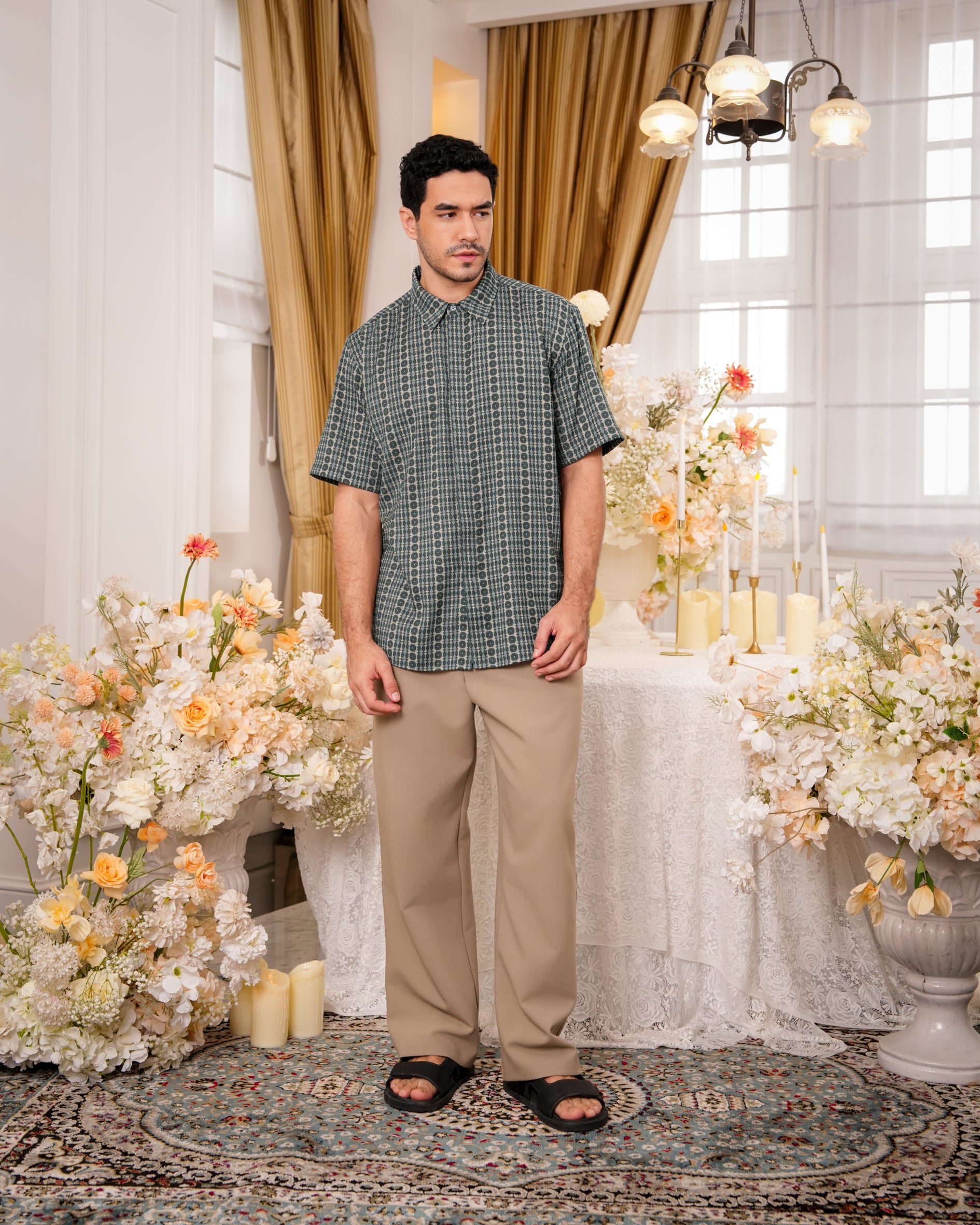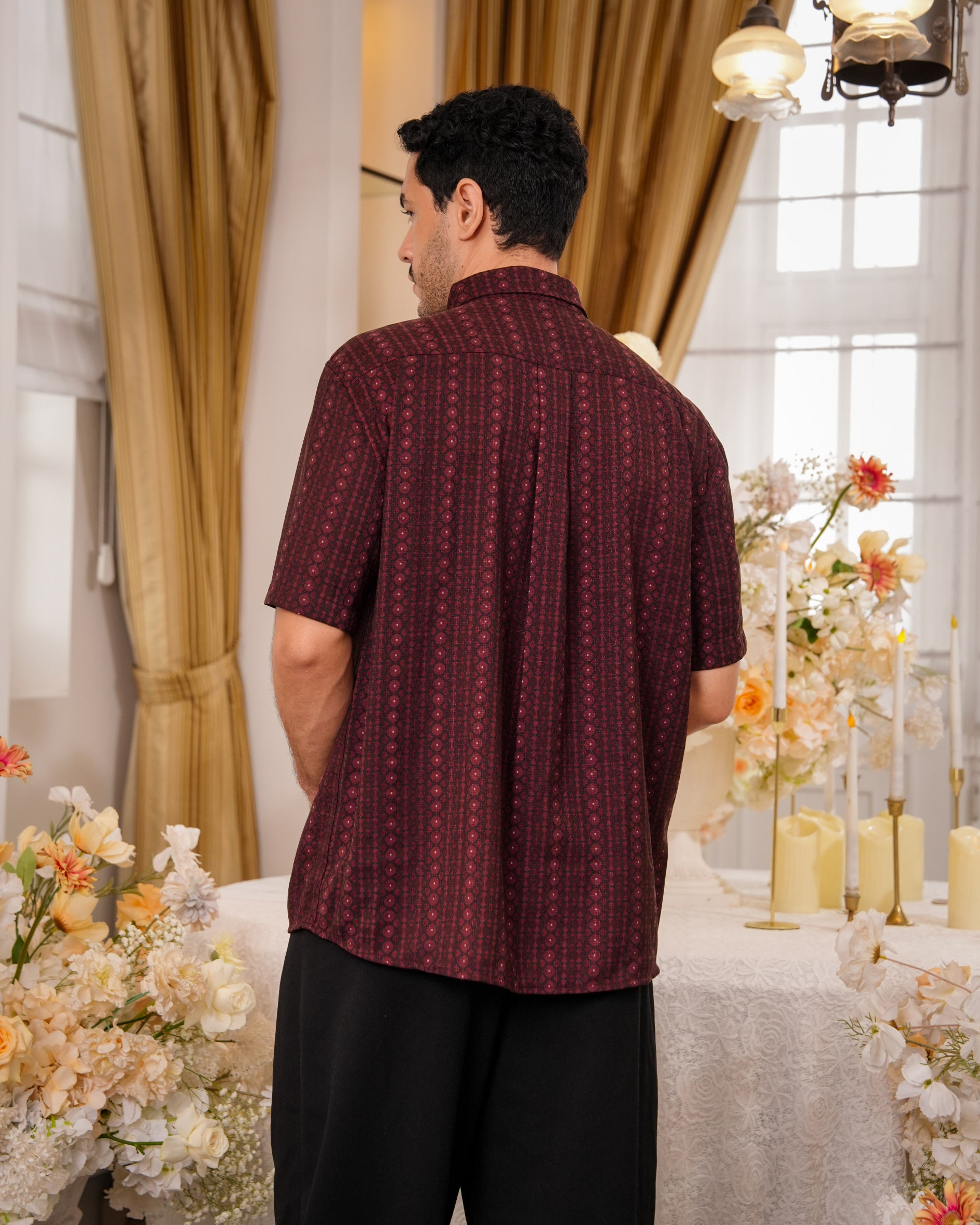 Baju koko lengan pendek dengan perpaduan conceal button, kerah kemeja, siluet regular fit, sentuhan warna klasik, dan motif yang elegan. Sempurna untuk temani momen Raya dan momen spesial lainnya.