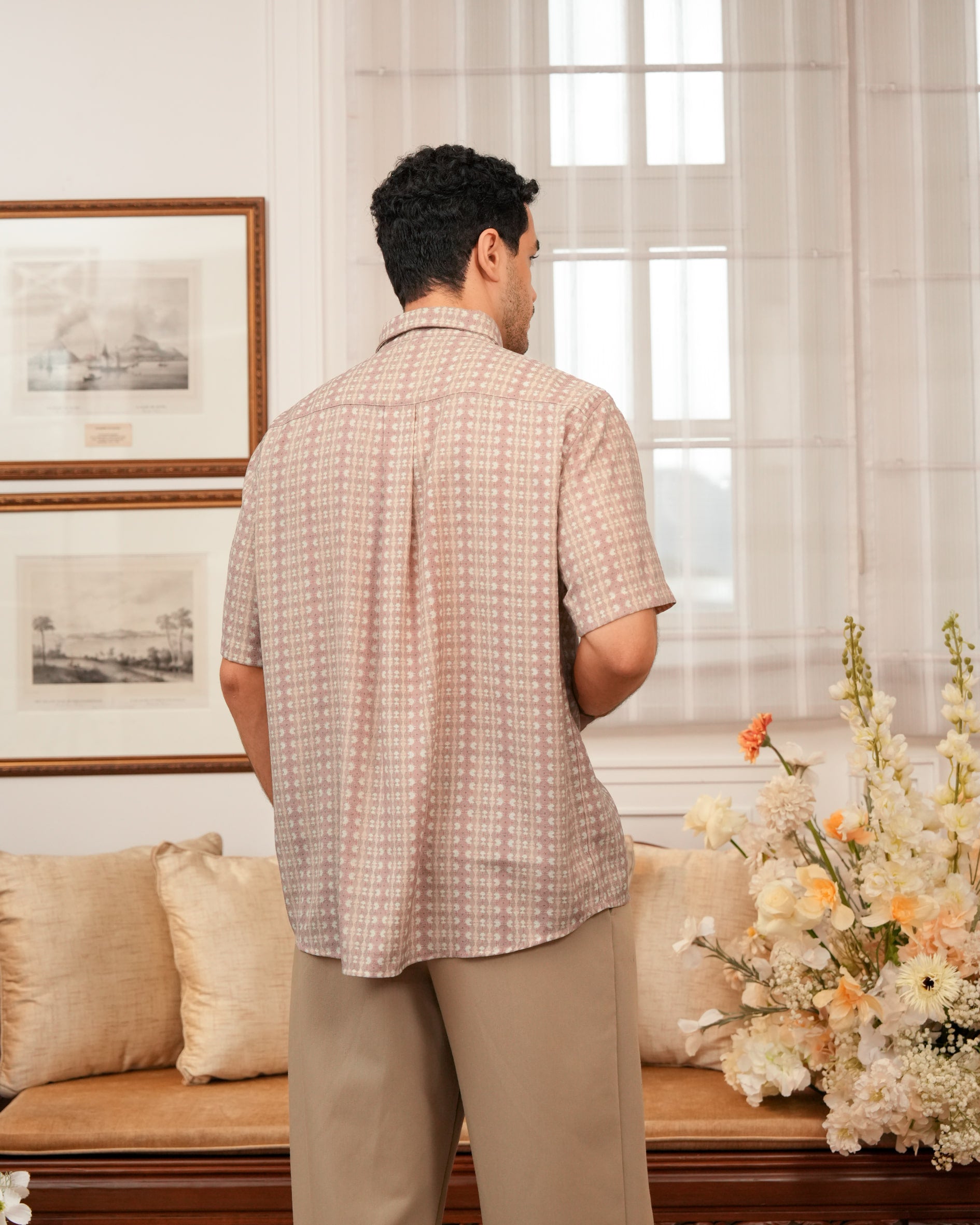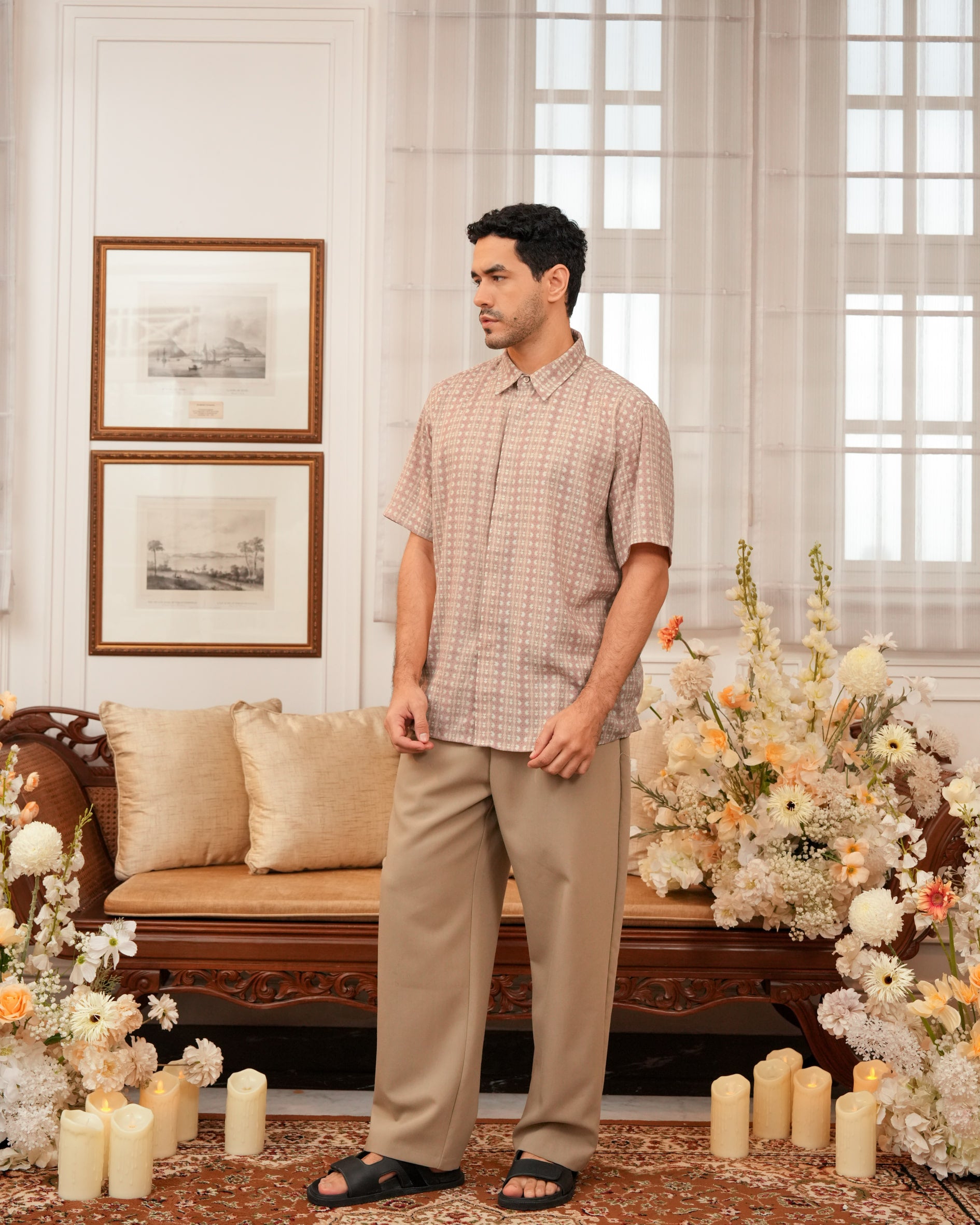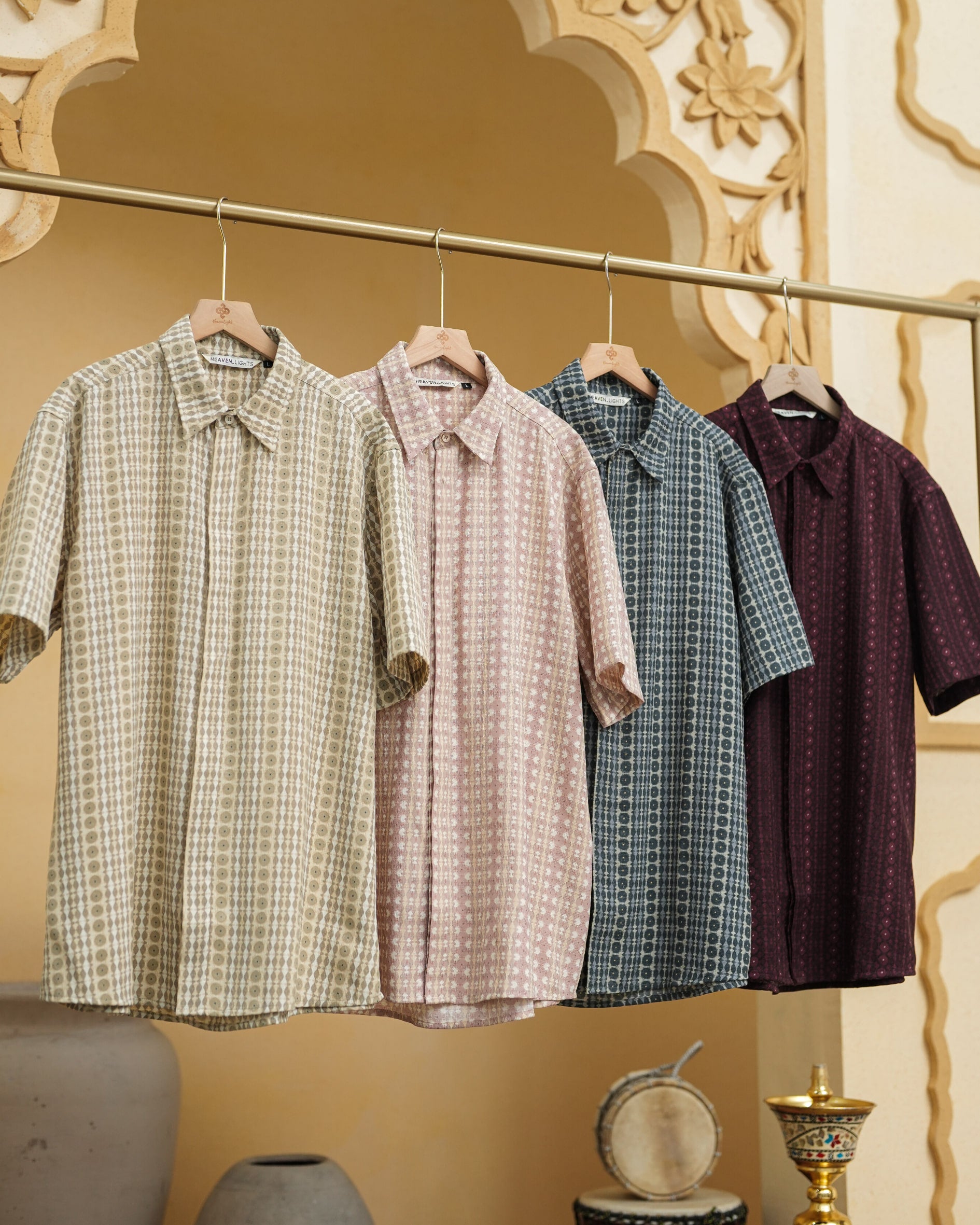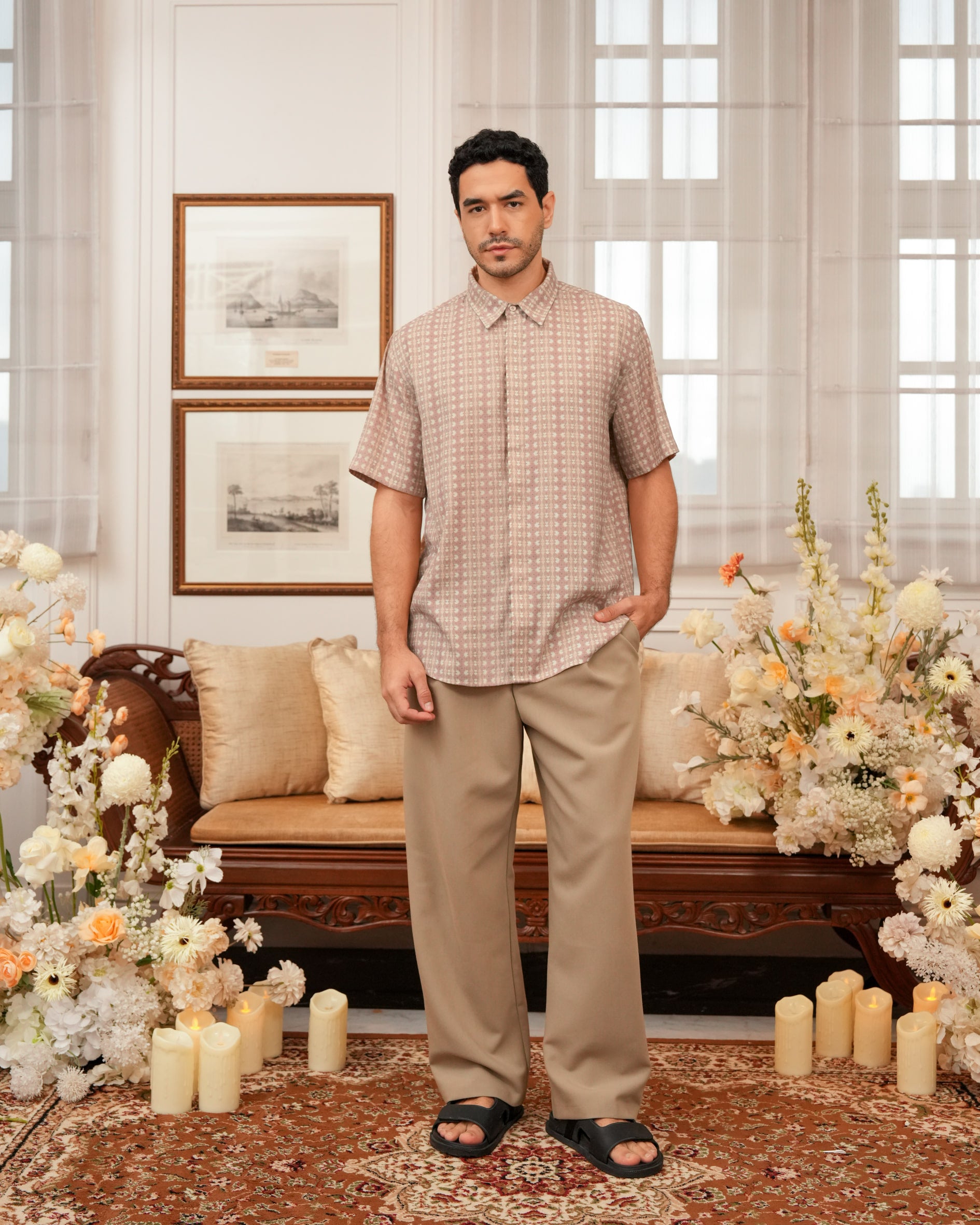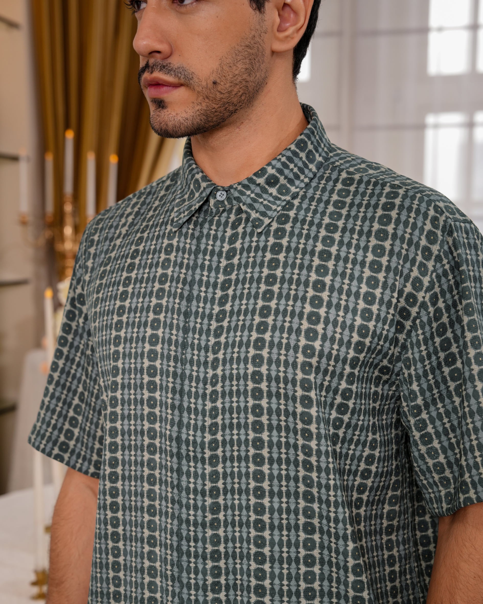 Baju koko lengan pendek dengan perpaduan conceal button, kerah kemeja, siluet regular fit, sentuhan warna klasik, dan motif yang elegan. Sempurna untuk temani momen Raya dan momen spesial lainnya.