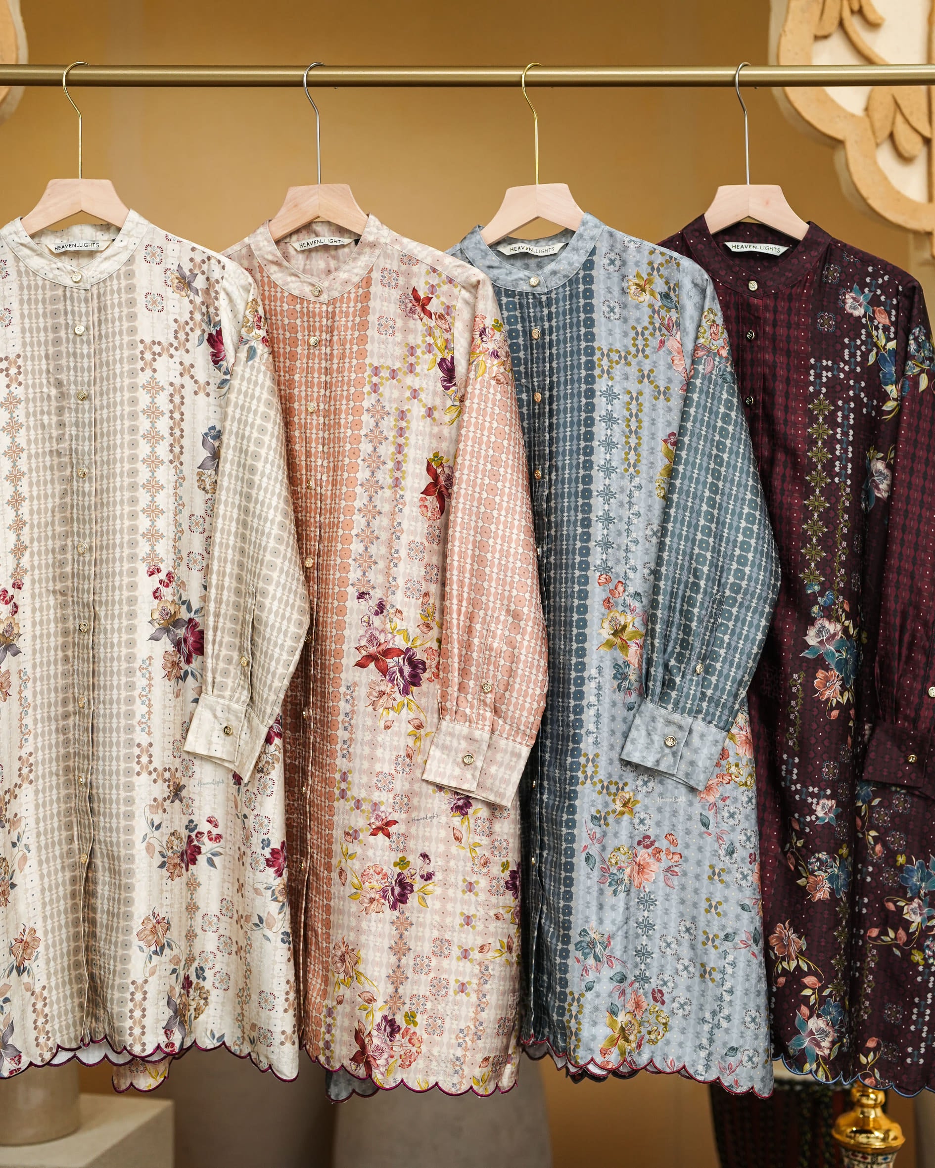 Tunic dengan kombinasi kerah bulat, kancing depan dan full print serta signature logo. Bahannya super adem dan sangat ringan, cocok untuk temani semua aktivitas, dipercantik aksen scallop pada bagian bawah.
